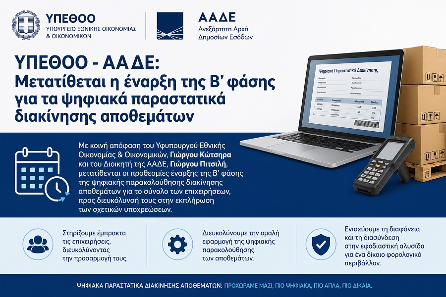ΥΠΕΘΟΟ - ΑΑΔΕ: Μετατίθεται η έναρξη της Β’ φάσης για τα ψηφιακά παραστατικά διακίνησης αποθεμάτων Νέα Επικαιρότητα Δελτία Τύπου ΑΑΔΕ Αθήνα, 30 Απριλίου 2026 ΥΠΕΘΟΟ - ΑΑΔΕ: Μετατίθεται η έναρξη της Β’ φάσης για τα ψηφιακά παραστατικά διακίνησης αποθεμάτων Με κοινή απόφαση του Υφυπουργού Εθνικής Οικονομίας & Οικονομικών, Γιώργου Κώτσηρα και του Διοικητή της ΑΑΔΕ, Γιώργου Πιτσιλή, μετατίθενται οι προθεσμίες έναρξης της Β’ φάσης της ψηφιακής παρακολούθησης διακίνησης αποθεμάτων για το σύνολο των επιχειρήσεων, προς διευκόλυνσή τους στην εκπλήρωση των σχετικών υποχρεώσεων. Η Β’ φάση τίθεται πλέον σε εφαρμογή τμηματικά, με επιμερισμό των υποχρεώσεων σε διακριτά στάδια, ως εξής: Από 12/10/2026 ενεργοποιούνται οι διαδικασίες φόρτωσης, μεταφόρτωσης και παραλαβής για την ψηφιακή παρακολούθηση και ιχνηλασιμότητα της διακίνησης αποθεμάτων, καθώς και η διαβίβαση των δεδομένων ποσοτικού και ποιοτικού ελέγχου. Από 1/1/2027 εφαρμόζεται η Ενιαία Κωδικοποίηση Ειδών, σύμφωνα με τη Συνδυασμένη Ονοματολογία (TARIC). Έως και την ημερομηνία έναρξης κάθε επιμέρους υποχρέωσης, παρέχεται η δυνατότητα προαιρετικής διαβίβασης των σχετικών δεδομένων στην ψηφιακή πλατφόρμα myDATA. Παράλληλα, εντός των προσεχών ημερών θα είναι διαθέσιμη η νέα έκδοση της εφαρμογής για κινητές συσκευές myDATAapp, η οποία θα ενσωματώνει δυνατότητα σάρωσης και παραλαβής παραστατικών, καθώς και τις λειτουργικότητες της έκδοσης 2.0.0 της εφαρμογής timologio, αναφορικά με τη Β’ φάση της ψηφιακής παρακολούθησης διακίνησης αποθεμάτων. Επισημαίνεται ότι από 1/12/2025, ισχύει η υποχρέωση ψηφιακής έκδοσης των παραστατικών διακίνησης και διαβίβασης των δεδομένων της Α’ φάσης. Ειδικά για τους ελαιοπαραγωγούς αγρότες, η έναρξη της σχετικής υποχρέωσης μετατίθεται για τις 12/10/2026. Η μετάθεση ισχύει υπό την προϋπόθεση ότι, κατά την παραλαβή του ελαιοκάρπου, εκδίδεται δελτίο ποσοτικής παραλαβής από τα ελαιοτριβεία και αφορά όσους δεν εντάσσονται στις υπόχρεες οντότητες της πρώτης περιόδου εφαρμογής. Για οποιαδήποτε πληροφορία ή διευκρίνιση, οι ενδιαφερόμενοι μπορούν να απευθύνονται στην Εξυπηρέτηση Φορολογουμένων της ΑΑΔΕ, my1521: Τηλεφωνικά: Στο 1521 (χωρίς χρέωση), εργάσιμες ημέρες από 7:00 έως 20:00. Ψηφιακά: Στο my1521 (24/7), επιλέγοντας: Θέματα Ελληνικών Λογιστικών Προτύπων & myDATA > Ψηφιακό Δελτίο Αποστολής Παναγιώτης Ράγγος Λογιστής Φοροτεχνικός Α΄ Τάξης - Πιστοποιημένος Εσωτερικός Ελεγκτή Previous Next