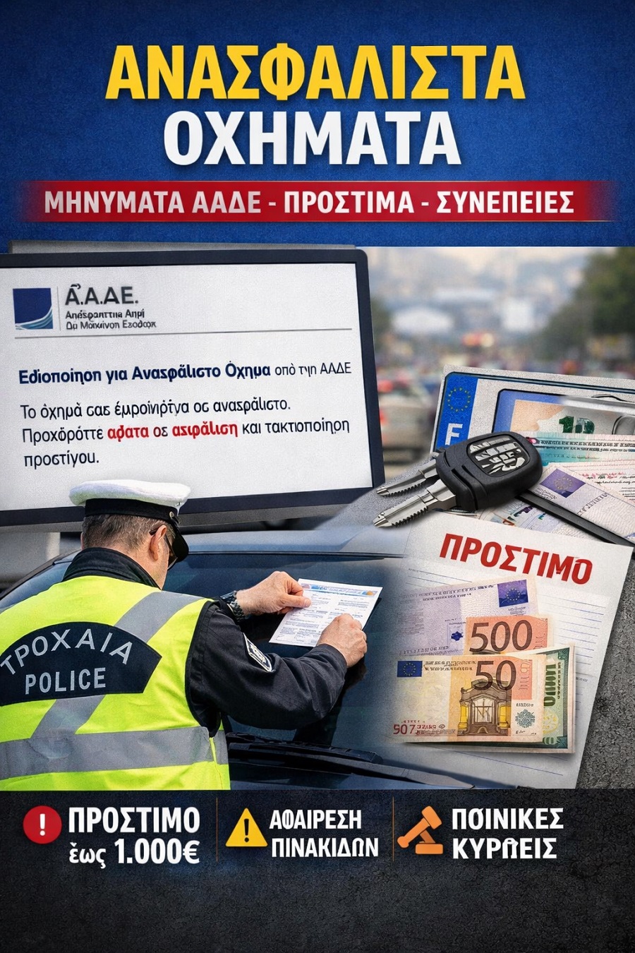 Ανασφάλιστα Οχήματα: Μηνύματα από την ΑΑΔΕ, Πρόστιμα και οι Συνέπειες για τους Ιδιοκτήτες Νέα Επικαιρότητα Νέος γύρος ελέγχων για τα ανασφάλιστα οχήματα βρίσκεται σε εξέλιξη, με την Ανεξάρτητη Αρχή Δημοσίων Εσόδων (ΑΑΔΕ) να αποστέλλει μαζικά ειδοποιητήρια και ηλεκτρονικά μηνύματα σε ιδιοκτήτες οχημάτων που εμφανίζονται χωρίς ενεργή ασφάλιση. Οι διασταυρώσεις στοιχείων γίνονται ηλεκτρονικά και στόχος είναι ο εντοπισμός όσων κυκλοφορούν χωρίς ασφαλιστήριο συμβόλαιο. Τα μηνύματα της ΑΑΔΕ αποστέλλονται μέσω του Taxisnet ή με ηλεκτρονική ειδοποίηση και καλούν τους ιδιοκτήτες να προχωρήσουν άμεσα σε ασφάλιση του οχήματός τους και στην τακτοποίηση του προβλεπόμενου προστίμου. Πώς εντοπίζονται τα ανασφάλιστα οχήματα Ο εντοπισμός γίνεται μέσω ηλεκτρονικών διασταυρώσεων μεταξύ: της βάσης δεδομένων της ΑΑΔΕ του Μητρώου Οχημάτων του Υπουργείου Υποδομών και Μεταφορών των στοιχείων που αποστέλλουν οι ασφαλιστικές εταιρείες Με τη διαδικασία αυτή εντοπίζονται τα οχήματα που είναι δηλωμένα σε κυκλοφορία αλλά δεν εμφανίζονται ασφαλισμένα. Σε αυτές τις περιπτώσεις αποστέλλεται αυτοματοποιημένο μήνυμα προς τον ιδιοκτήτη. Τι αναφέρουν τα μηνύματα της ΑΑΔΕ Στα ειδοποιητήρια που λαμβάνουν οι ιδιοκτήτες αναφέρεται ότι το όχημα εμφανίζεται ως ανασφάλιστο και καλούνται να προβούν άμεσα στις απαραίτητες ενέργειες. Συγκεκριμένα, οι ιδιοκτήτες καλούνται: να ασφαλίσουν το όχημα σε ασφαλιστική εταιρεία να πληρώσουν το σχετικό παράβολο ή πρόστιμο να επιβεβαιώσουν ότι το όχημα βρίσκεται νόμιμα σε κυκλοφορία Σε περίπτωση που το όχημα έχει ήδη ασφαλιστεί ή δεν κυκλοφορεί (π.χ. έχει τεθεί σε ακινησία), οι ιδιοκτήτες πρέπει να ελέγξουν τα στοιχεία και να προχωρήσουν στις απαραίτητες διορθώσεις. Τα πρόστιμα για τα ανασφάλιστα οχήματα Η νομοθεσία προβλέπει συγκεκριμένα διοικητικά πρόστιμα για τα ανασφάλιστα οχήματα: 250 ευρώ για δίκυκλα 500 ευρώ για επιβατικά αυτοκίνητα 1.000 ευρώ για λεωφορεία και φορτηγά δημόσιας χρήσης Τα ποσά αυτά επιβάλλονται διοικητικά, ενώ ο ιδιοκτήτης υποχρεούται παράλληλα να ασφαλίσει το όχημά του. Τι πρέπει να κάνουν οι ιδιοκτήτες Όσοι λάβουν μήνυμα από την ΑΑΔΕ θα πρέπει να κινηθούν άμεσα για να αποφύγουν επιπλέον κυρώσεις. Τα βασικά βήματα είναι: Έλεγχος των στοιχείων του οχήματος στο Taxisnet. Άμεση ασφάλιση του οχήματος εφόσον είναι ανασφάλιστο. Πληρωμή του προστίμου ή του παραβόλου που αναφέρεται στο ειδοποιητήριο. Η συμμόρφωση πρέπει να γίνει εντός του χρονικού διαστήματος που ορίζεται στο μήνυμα. Οι συνέπειες σε περίπτωση ελέγχου Εκτός από τα διοικητικά πρόστιμα, σε περίπτωση ελέγχου από την Τροχαία για ανασφάλιστο όχημα προβλέπονται αυστηρότερες κυρώσεις, όπως: αφαίρεση πινακίδων κυκλοφορίας αφαίρεση άδειας κυκλοφορίας χρηματικά πρόστιμα ποινικές κυρώσεις για τον ιδιοκτήτη ή οδηγό Παράλληλα, σε περίπτωση τροχαίου ατυχήματος με ανασφάλιστο όχημα, ο οδηγός μπορεί να βρεθεί αντιμέτωπος με ιδιαίτερα υψηλές αποζημιώσεις, καθώς θα κληθεί να καλύψει προσωπικά τις ζημιές. Γιατί εντατικοποιούνται οι έλεγχοι Οι ηλεκτρονικές διασταυρώσεις έχουν στόχο τη μείωση των ανασφάλιστων οχημάτων που κυκλοφορούν στους ελληνικούς δρόμους. Τα ανασφάλιστα οχήματα αποτελούν σοβαρό πρόβλημα τόσο για την οδική ασφάλεια όσο και για την οικονομική προστασία των πολιτών σε περίπτωση ατυχήματος. Η ασφάλιση του οχήματος είναι υποχρεωτικ