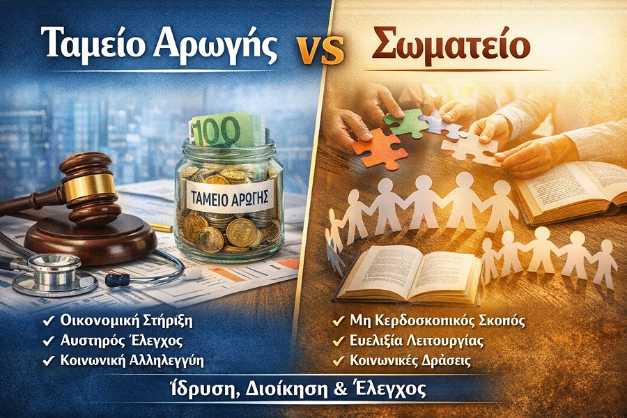 Ταμείο Αρωγής vs Σωματείο: Νομικό Πλαίσιο, Ίδρυση, Διοίκηση και Έλεγχος Νέα Επικαιρότητα Η δημιουργία ενός σωματείου ή ενός ταμείου αρωγής αποτελεί σημαντική πρωτοβουλία συλλογικής οργάνωσης και κοινωνικής αλληλεγγύης. Παρότι συχνά συνδέονται μεταξύ τους, πρόκειται για δύο διαφορετικές έννοιες με διαφορετικές νομικές και λειτουργικές απαιτήσεις. Το παρόν άρθρο λειτουργεί ως πρακτικός οδηγός και αναλύει: τις διαφορές τους τη διαδικασία ίδρυσης τα απαιτούμενα μέλη τη διοίκηση και λειτουργία τους ελέγχους και την εποπτεία ■ Τι είναι το σωματείο Το σωματείο είναι ένωση προσώπων με μη κερδοσκοπικό σκοπό (π.χ. πολιτιστικό, επαγγελματικό, κοινωνικό). Βασικά χαρακτηριστικά: ,Δεν έχει κερδοσκοπικό σκοπό ,Έχει νομική προσωπικότητα Λειτουργεί με καταστατικό Δεν υποχρεούται να παρέχει οικονομικές ενισχύσεις ■ Τι είναι το ταμείο αρωγής Το ταμείο αρωγής αποτελεί μηχανισμό οικονομικής στήριξης των μελών, συνήθως μέσα σε ένα σωματείο. Σκοπός: ενίσχυση σε περιπτώσεις: ασθένειας ατυχήματος οικονομικής ανάγκης Διαχειρίζεται χρήματα με συγκεκριμένο κοινωνικό σκοπό, κάτι που το διαφοροποιεί ουσιαστικά από το σωματείο. ■ Διαδικασία ίδρυσης Ίδρυση σωματείου Η ίδρυση σωματείου είναι τυπικά καθορισμένη. > Απαιτούμενα μέλη Ελάχιστος αριθμός: 20 ιδρυτικά μέλη Βασικά βήματα: Σύνταξη καταστατικού Περιλαμβάνει: επωνυμία σκοπό έδρα > όργανα διοίκησης Υπογραφή από τα ιδρυτικά μέλη Κατάθεση στο αρμόδιο Πρωτοδικείο Έγκριση και εγγραφή στο βιβλίο σωματείων -> Από τη στιγμή της εγγραφής αποκτά νομική προσωπικότητα. ■ Ίδρυση ταμείου αρωγής Το ταμείο αρωγής δεν ιδρύεται αυτόνομα (στις περισσότερες περιπτώσεις), αλλά εντός σωματείου. Βασικά βήματα: ,Απόφαση Γενικής Συνέλευσης ,Έγκριση δημιουργίας ,Καθορισμός βασικών αρχών ,Καταστατική πρόβλεψη Ενσωμάτωση στο καταστατικό ή τροποποίηση αυτού Περιλαμβάνει: > σκοπό > πόρους > δικαιούχους Καθορισμός πόρων > εισφορές μελών > δωρεές επιχορηγήσεις ■ Κανονισμός λειτουργίας Πολύ σημαντικός για την πράξη: διαδικασία αιτήσεων κριτήρια ύψος παροχών Διοίκηση και όργανα ■ Διοίκηση σωματείου Βασικά όργανα: 1. Γενική Συνέλευση Ανώτατο όργανο Λαμβάνει βασικές αποφάσεις 2. Διοικητικό Συμβούλιο Διαχειρίζεται τις υποθέσεις Εκπροσωπεί το σωματείο 3. Ελεγκτική Επιτροπή Ελέγχει τα οικονομικά -> Ο αριθμός μελών του Δ.Σ. ορίζεται στο καταστατικό (συνήθως 5–7 μέλη). ■ Διοίκηση ταμείου αρωγής Το ταμείο αρωγής λειτουργεί με πιο εξειδικευμένη δομή. Πιθανή δομή: Επιτροπή διαχείρισης ταμείου ή υπεύθυνος ταμείου Αρμοδιότητες: αξιολόγηση αιτήσεων έγκριση παροχών διαχείριση πόρων -> Συχνά υπάρχει διασταύρωση ρόλων με το Δ.Σ., αλλά απαιτείται σαφής διαχωρισμός για λόγους διαφάνειας. ■ Λειτουργία Λειτουργία σωματείου Υλοποίηση δράσεων (εκδηλώσεις, δραστηριότητες) Διαχείριση μελών Τήρηση βασικών οικονομικών στοιχείων -> Έχει μεγαλύτερη ευελιξία. ■ Λειτουργία ταμείου αρωγής Διαδικασία: Υποβολή αίτησης Έλεγχος δικαιολογητικών Αξιολόγηση με κριτήρια Απόφαση Καταβολή ενίσχυσης Απαιτήσεις: αντικειμενικά κριτήρια καταγραφή αποφάσεων πλήρης διαφάνεια Γιατί το ταμείο αρωγής έχει αυξημένη εποπτεία Διαχειρίζεται χρήματα για συγκεκριμένο σκοπό Δημιουργεί οικονομικές υποχρεώσεις Αφορά ευαίσθητες κοινωνικές ανάγκες Υπάρχει αυξημένος κίνδυνος κακοδιαχείρισης -> Γι’ αυτό απαιτείται αυστηρότερο πλαίσιο ελέγχου σε σχέση με το σωματεί