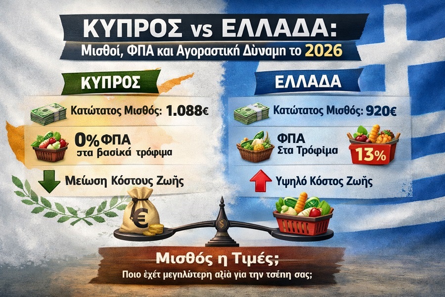 Κύπρος vs Ελλάδα: Μισθοί, ΦΠΑ και η πραγματική αγοραστική δύναμη το 2026 Νέα Επικαιρότητα Το 2026 φέρνει μια ενδιαφέρουσα σύγκριση ανάμεσα σε Κύπρο και Ελλάδα: δύο οικονομίες με παρόμοια χαρακτηριστικά, αλλά διαφορετική προσέγγιση στην ενίσχυση του εισοδήματος των πολιτών. ■ Η περίπτωση της Κύπρου: αυξήσεις με… φρένο Στην Κύπρο, ο κατώτατος μισθός αυξήθηκε στα 1.088 ευρώ. Ωστόσο, η σχέση του με τον διάμεσο μισθό παραμένει γύρω στο 57%, δείχνοντας ότι οι αυξήσεις δεν αρκούν για να κλείσουν την ψαλίδα των εισοδημάτων. Παράλληλα, η κυβέρνηση επιλέγει μια διαφορετική στρατηγική: μηδενικό ΦΠΑ σε βασικά τρόφιμα. Αυτό σημαίνει ότι η στήριξη δεν έρχεται μόνο μέσω μισθών, αλλά και μέσω της μείωσης του κόστους ζωής. ■ Η Ελλάδα: έμφαση στον κατώτατο μισθό Στην Ελλάδα, ο κατώτατος μισθός αυξάνεται στα 920 ευρώ. Η πολιτική εστιάζει κυρίως στη σταδιακή αύξηση των αποδοχών, με στόχο τα 950 ευρώ έως το 2027. Ωστόσο, σε αντίθεση με την Κύπρο, δεν υπάρχει μηδενικός ΦΠΑ στα τρόφιμα. Έτσι, η αύξηση του εισοδήματος συχνά «ροκανίζεται» από το υψηλό κόστος ζωής. ■ Η μεγάλη διαφορά: τιμές ή μισθοί; Η ουσιαστική διαφορά ανάμεσα στις δύο χώρες είναι στρατηγική: - Η Κύπρος παρεμβαίνει και στις τιμές - Η Ελλάδα κυρίως στους μισθούς Αυτό έχει μεγάλη σημασία, γιατί η πραγματική ευημερία δεν εξαρτάται μόνο από το πόσα κερδίζεις, αλλά και από το πόσα πληρώνεις. ■ Συμπέρασμα – Σχόλιο Η Κύπρος δείχνει να ακολουθεί μια πιο «ισορροπημένη» πολιτική, συνδυάζοντας μισθολογικές αυξήσεις με άμεση μείωση του κόστους ζωής. Η Ελλάδα, αντίθετα, επενδύει κυρίως στην αύξηση του κατώτατου μισθού, χωρίς αντίστοιχη παρέμβαση στις τιμές. Το ερώτημα που προκύπτει είναι απλό αλλά κρίσιμο: Τι έχει μεγαλύτερη σημασία για τον πολίτη, ένας υψηλότερος μισθός ή ένα χαμηλότερο καλάθι; Η απάντηση πιθανότατα βρίσκεται κάπου στη μέση. Και ίσως εκεί κρίνεται και η αποτελεσματικότητα της οικονομικής πολιτικής κάθε χώρας. Παναγιώτης Ράγγος Λογιστής Φοροτεχνικός Α΄ Τάξης - Πιστοποιημένος Εσωτερικός Ελεγκτή Previous Next