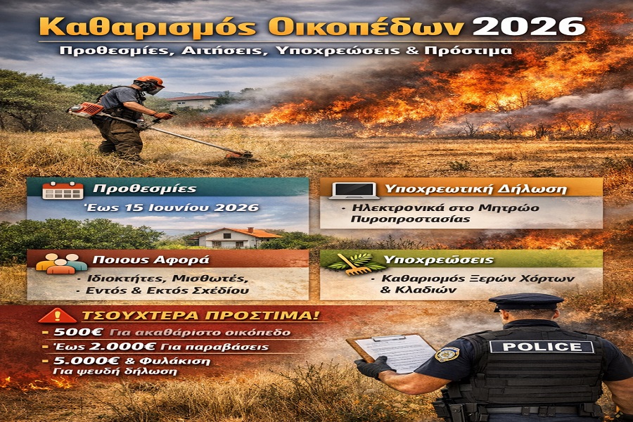 Καθαρισμός οικοπέδων 2026: Προθεσμίες, αιτήσεις, υποχρεώσεις και πρόστιμα – Όλα όσα πρέπει να γνωρίζουν οι ιδιοκτήτες Νέα Επικαιρότητα Σε πλήρη εφαρμογή τίθεται από την 1η Απριλίου 2026 το μέτρο του υποχρεωτικού καθαρισμού οικοπέδων, στο πλαίσιο της αντιπυρικής περιόδου. Χιλιάδες ιδιοκτήτες καλούνται να συμμορφωθούν με συγκεκριμένες υποχρεώσεις, ενώ τα πρόστιμα για παραβάσεις είναι ιδιαίτερα αυστηρά. ■ Προθεσμίες για τον καθαρισμό οικοπέδων Η περίοδος καθαρισμού για το 2026 έχει ως εξής: Έναρξη: 1 Απριλίου 2026 Λήξη καθαρισμού: 15 Ιουνίου 2026 Υποχρέωση συντήρησης: έως 31 Οκτωβρίου 2026 (λήξη αντιπυρικής περιόδου) Οι ιδιοκτήτες δεν αρκεί να καθαρίσουν το οικόπεδο μία φορά, αλλά οφείλουν να το διατηρούν καθαρό καθ’ όλη τη διάρκεια του καλοκαιριού. ■ Αιτήσεις – Δήλωση καθαρισμού Για το 2026 είναι υποχρεωτική η ηλεκτρονική δήλωση των εργασιών καθαρισμού: Υποβάλλεται στο Εθνικό Μητρώο Τήρησης Μέτρων Προληπτικής Πυροπροστασίας Προθεσμία υποβολής: έως 15 Ιουνίου 2026 Η πλατφόρμα ανοίγει από 1η Απριλίου 2026 -> Σημαντικό: Μετά την υποβολή, δεν επιτρέπονται διορθώσεις, άρα απαιτείται προσοχή στα στοιχεία. ■ Ποιους αφορά Η υποχρέωση καθαρισμού αφορά: > Ιδιοκτήτες οικοπέδων > Επικαρπωτές > Μισθωτές και υπομισθωτές Για ακίνητα που βρίσκονται: > Εντός σχεδίου πόλης > Εντός οικισμών (με ή χωρίς σχέδιο) > Σε ακάλυπτους χώρους κοντά σε κατοικημένες περιοχές ■ Τι περιλαμβάνει ο υποχρεωτικός καθαρισμός Οι ιδιοκτήτες οφείλουν να προχωρήσουν σε: > Απομάκρυνση ξερών χόρτων και βλάστησης > Κοπή και απομάκρυνση ξερών δέντρων και κλαδιών > Καθαρισμό εύφλεκτων υλικών και απορριμμάτων > Αραίωση θάμνων και χαμηλής βλάστησης > Κλάδεμα δέντρων και απομάκρυνση κλαδιών κοντά σε κτίρια Στόχος είναι η μείωση του κινδύνου εκδήλωσης και εξάπλωσης πυρκαγιάς. ■ Πρόστιμα και κυρώσεις Το νέο πλαίσιο προβλέπει αυστηρές ποινές: > 500 ευρώ πρόστιμο για μη καθαρισμό οικοπέδου > 100 ευρώ πρόστιμο για μη υποβολή δήλωσης (αν έχει γίνει καθαρισμός) > Έως 2.000 ευρώ πρόστιμα σε σοβαρές περιπτώσεις ή επαναλαμβανόμενες παραβάσεις > 5.000 ευρώ και φυλάκιση για ψευδή δήλωση Παράλληλα, οι δήμοι μπορούν να προχωρήσουν σε αυτεπάγγελτο καθαρισμό και να χρεώσουν το κόστος στον ιδιοκτήτη. ■ Έλεγχοι και επιτήρηση > Οι έλεγχοι ξεκινούν από την άνοιξη και εντατικοποιούνται το καλοκαίρι > Δειγματοληπτικοί και στοχευμένοι έλεγχοι πραγματοποιούνται έως τον Οκτώβριο > Οι καταγγελίες πολιτών μπορούν να ενεργοποιήσουν άμεσο έλεγχο ■ Τι πρέπει να προσέξουν οι ιδιοκτήτες > Να καθαρίσουν εγκαίρως (όχι τελευταία στιγμή) > Να υποβάλουν σωστά τη δήλωση > Να διατηρούν το οικόπεδο καθαρό όλο το καλοκαίρι > Να αποφεύγουν ψευδείς δηλώσεις ■ Συμπέρασμα Ο καθαρισμός οικοπέδων για το 2026 αποτελεί υποχρέωση με αυστηρό πλαίσιο ελέγχου και υψηλά πρόστιμα. Η συμμόρφωση δεν είναι μόνο νομική υποχρέωση, αλλά και κρίσιμο μέτρο για την πρόληψη καταστροφικών πυρκαγιών. Οι ιδιοκτήτες καλούνται να κινηθούν έγκαιρα, καθώς φέτος το σύστημα είναι πιο οργανωμένο, ψηφιοποιημένο και αυστηρό από ποτέ. Παναγιώτης Ράγγος Λογιστής Φοροτεχνικός Α΄ Τάξης - Πιστοποιημένος Εσωτερικός Ελεγκτή Previous Next