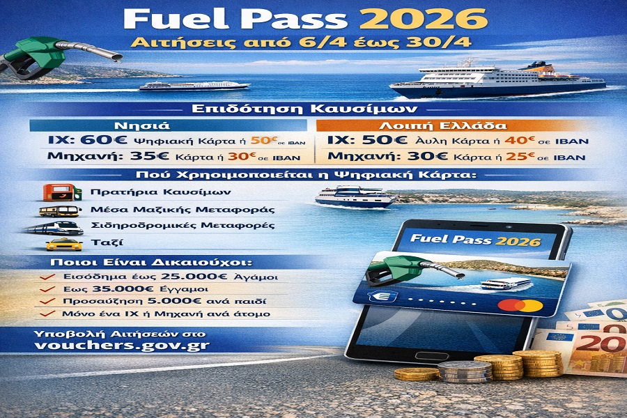 Fuel Pass 2026: Όλες οι λεπτομέρειες για αιτήσεις, ψηφιακή κάρτα και ποσά επιδότησης Νέα Επικαιρότητα Οικονομία Το νέο πρόγραμμα Fuel Pass 2026 ξεκινά την ερχόμενη εβδομάδα, παρέχοντας οικονομική ενίσχυση σε νοικοκυριά και ελεύθερους επαγγελματίες για την αγορά καυσίμων. Οι αιτήσεις θα υποβάλλονται ηλεκτρονικά στην πλατφόρμα vouchers.gov.gr από 6 έως 30 Απριλίου 2026, με χρήση κωδικών TAXISnet για αυθεντικοποίηση. Η διαδικασία μπορεί επίσης να ολοκληρωθεί μέσω των ΚΕΠ για όσους προτιμούν την προσωπική εξυπηρέτηση. Ποιοι είναι δικαιούχοι Δικαιούχοι είναι φυσικά πρόσωπα που: Είναι φορολογικοί κάτοικοι Ελλάδας Έχουν δηλωθέν οικογενειακό εισόδημα του 2024 (δηλωθέν το 2025) εντός των ορίων: Άγαμοι: έως 25.000€ Έγγαμοι/Μέρη Συμβίωσης: έως 35.000€ Μονογονεϊκές οικογένειες: έως 39.000€ Προσαύξηση 5.000€ ανά εξαρτώμενο τέκνο Πρόσθετη προσαύξηση μονογονεϊκών ανά τέκνο πέραν του πρώτου: 5.000€ Κάθε φυσικό πρόσωπο μπορεί να δηλώσει ένα όχημα (ΙΧ ή μοτοσυκλέτα) στο οποίο διαθέτει πλήρη κυριότητα, συγκυριότητα ή σύμβαση leasing. Το όχημα πρέπει να: Κυκλοφορεί κανονικά Είναι ασφαλισμένο Να μην οφείλονται τέλη κυκλοφορίας Ο έλεγχος γίνεται αυτόματα μέσω διαλειτουργικοτήτων με την ΑΑΔΕ, την Επικουρική Ασφάλιση και την Ελληνική Αστυνομία. Ενεργοποίηση ψηφιακής κάρτας Μετά την έγκριση της αίτησης: Η ΚτΠ Μ.Α.Ε. διαβιβάζει την εγκριτική απόφαση στο συνεργαζόμενο πιστωτικό ίδρυμα. Ο δικαιούχος λαμβάνει: SMS με οδηγίες στο κινητό του Email με σύνδεσμο για ενεργοποίηση Σημειώνεται ότι μετά την έγκριση, η αίτηση δεν τροποποιείται. Υπάρχει διαθέσιμο εγχειρίδιο χρήσης και help desk για τεχνική υποστήριξη. Πού γίνεται δεκτή η ψηφιακή κάρτα Το ποσό της κάρτας χρησιμοποιείται αποκλειστικά για τις εξής κατηγορίες: Πρατήρια καυσίμων και αυτόματοι πωλητές (MCC 5541, 5542, 5983) Μέσα Μαζικής Μεταφοράς: λεωφορεία, αστικές και προαστιακές συγκοινωνίες, πλοία-φέρι (MCC 4111, 4131, 4011) Σιδηροδρομικές μεταφορές επιβατών (MCC 4112) Ταξί (MCC 4121) Ρητώς απαγορεύεται: Ανάληψη μετρητών Μεταφορά ποσού σε τρίτο πρόσωπο Χρήση εκτός των παραπάνω κατηγοριών Η κάρτα λειτουργεί αποκλειστικά μέσω ανέπαφων συναλλαγών (Web/Virtual POS). Ποσά επιδότησης Κατηγορία Νησιά Λοιπή Ελλάδα Ιδιοκτήτες ΙΧ 60€ (ψηφιακή κάρτα) / 50€ (IBAN) 50€ / 40€ Ιδιοκτήτες μοτοσυκλέτας 35€ / 30€ 30€ / 25€ Νησιωτικές περιοχές περιλαμβάνουν: Βόρειο και Νότιο Αιγαίο, Ιόνια Νησιά, Κρήτη, Νήσοι Αττικής, Σποράδες, Θάσος, Σκύρος, Σαμοθράκη, Αμμουλιανή. Κλείσιμο Το Fuel Pass 2026 αποτελεί σημαντική στήριξη για τα νοικοκυριά και τις μικρές επιχειρήσεις, μειώνοντας το κόστος μετακίνησης και ενέργειας. Η διαδικασία είναι απλή, γρήγορη και πλήρως ψηφιοποιημένη, ενώ παρέχεται πλήρης υποστήριξη για τυχόν προβλήματα ή απορίες. Παναγιώτης Ράγγος Λογιστής Φοροτεχνικός Α΄ Τάξης - Πιστοποιημένος Εσωτερικός Ελεγκτή Previous Next