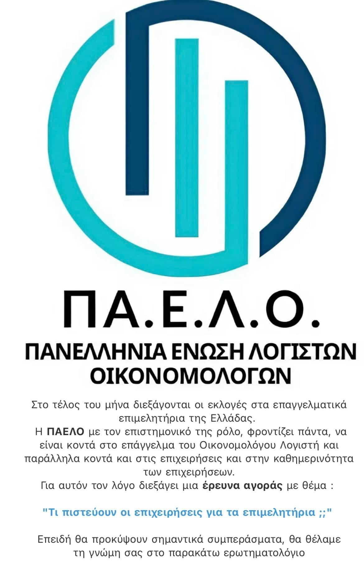 Έρευνα αγοράς για επιμελητήρια Στόχος μας είναι να αντλήσουμε σημαντικά συμπεράσματα που θα συμβάλουν στην περαιτέρω ενίσχυση της αξίας των επιμελητηρίων για τις επιχειρήσεις και τους επαγγελματίες του κλάδου. Η άποψή σας είναι ιδιαίτερα πολύτιμη για εμάς, και θα θέλαμε να σας προσκαλέσουμε να συμμετάσχετε στην έρευνα, συμπληρώνοντας το παρακάτω ερωτηματολόγιο. Σας ευχαριστούμε θερμά για τον χρόνο και την πολύτιμη συνεισφορά σας. Ερωτηματολόγιο "εδώ" Previous Next
