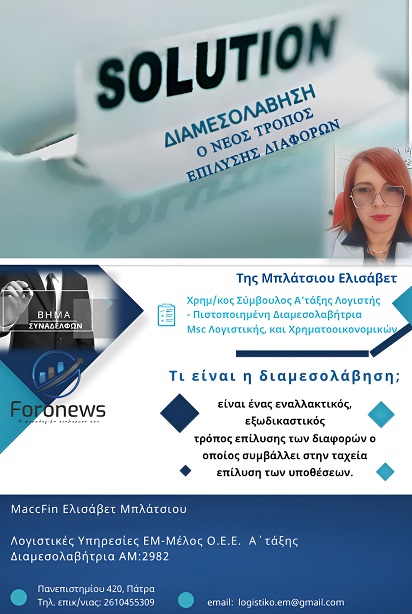 Διαμεσολάβηση - Ο νέος τρόπος επίλυσης διαφορών Τι είναι η διαμεσολάβηση; είναι ένας εναλλακτικός, εξωδικαστικός τρόπος επίλυσης των διαφορών ο οποίος συμβάλλει στην ταχεία επίλυση των υποθέσεων.