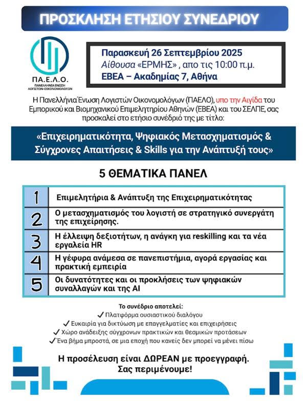 Η ΠΑ.Ε.Λ.Ο. διοργανώνει το ετήσιο συνέδριό της, το οποίο τελεί υπό την Αιγίδα του ΕΒΕΑ και του ΣΕΛΠΕ, φέρνοντας στο ίδιο τραπέζι θεσμικούς φορείς, επιχειρήσεις και επαγγελματίες. Στόχος δεν είναι μόνο η καταγραφή των προκλήσεων, αλλά κυρίως η παρουσίαση λύσεων και πρακτικών προτάσεων. Η επιχειρηματικότητα κινείται σε περιβάλλον διαρκούς αλλαγής και αβεβαιότητας, με τις μικρομεσαίες επιχειρήσεις να αποτελούν το θεμέλιο της οικονομίας και να χρειάζονται στήριξη. Ο ψηφιακός μετασχηματισμός δεν είναι επιλογή, αλλά προϋπόθεση βιωσιμότητας, ενώ η τεχνολογία και η Τεχνητή Νοημοσύνη αλλάζουν τον τρόπο λειτουργίας των γραφείων και των επιχειρήσεων.