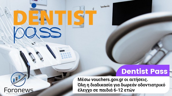 Ξεκίνησε σήμερα το πρωί  (24.05.2023) η πλατφόρμα για το πρόγραμμα Dentist Pass. Οι αιτήσεις για πρόγραμμα προληπτικής οδοντιατρικής, το οποίο αφορά σε πάνω από 660.000 παιδιά ηλικίας από 6 έως 12 ετών, χωρίς εισοδηματικά ή άλλα κριτήρια, γίνονται μέσω του vouchers.gov.gr.