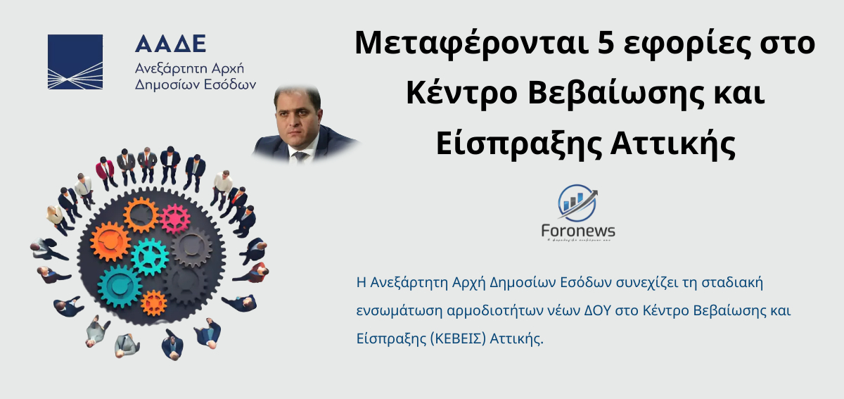 Η Ανεξάρτητη Αρχή Δημοσίων Εσόδων συνεχίζει τη σταδιακή ενσωμάτωση αρμοδιοτήτων νέων ΔΟΥ στο Κέντρο Βεβαίωσης και Είσπραξης (ΚΕΒΕΙΣ) Αττικής.