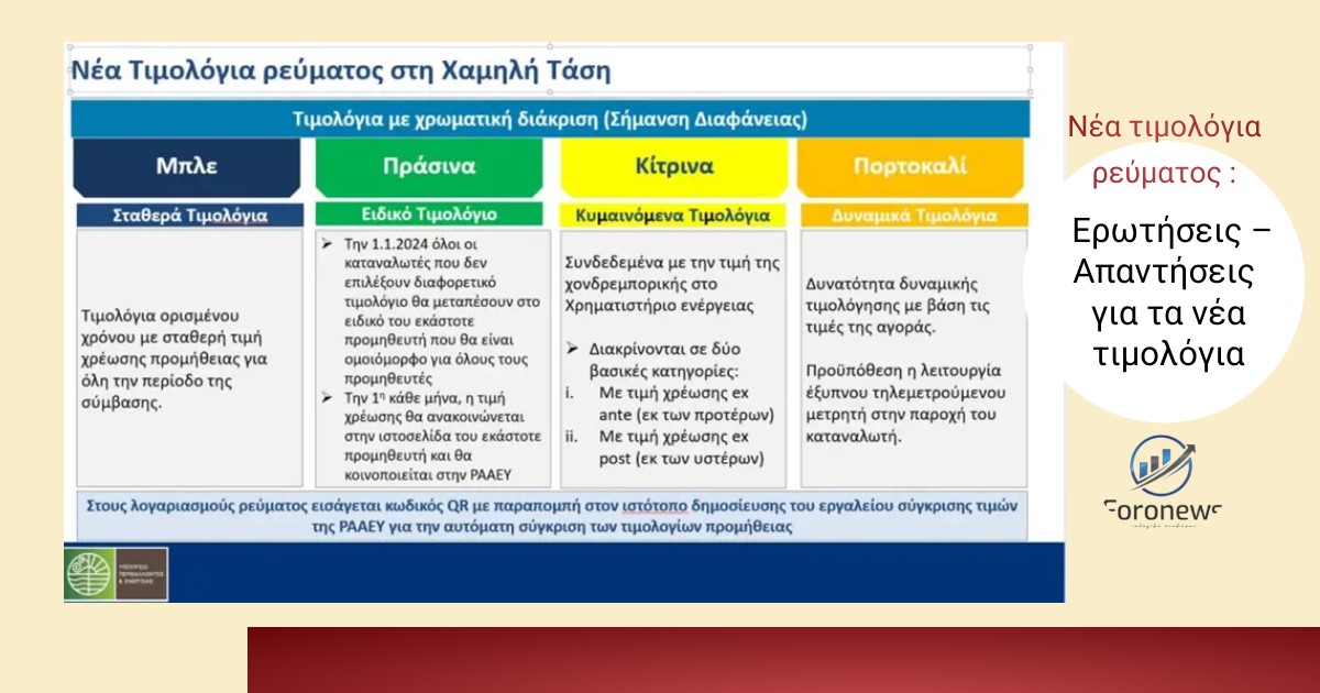 Σε αυτά τα τιμολόγια προσθέτουμε ειδικό τιμολόγιο, πράσινου χρώματος, που το ειδικό χαρακτηριστικό του είναι πως η δομή του θα είναι απλή και κοινή, επιτρέποντας τη συγκρισιμότητα, για όλους τους παρόχους. Σε αυτό θα μεταπέσουν όλοι οι καταναλωτές, την 1η Ιανουαρίου του 2024, οι οποίοι δεν θα έχουν επιλέξει -μέσα στο 2023- κάποιο συγκεκριμένο είδος τιμολογίου για τη μετάβασή τους την 1.1.2024. Ωστόσο, με μία απλή δήλωση στον πάροχό τους έως 31/01/2024, μπορούν να παραμείνουν στο προηγούμενο τιμολόγιο. Επίσης, για όποιες αλλαγές τιμολογίων γίνουν στη συνέχεια ακολουθείται η συνήθης διαδικασία. Σημειώνεται πως το ειδικό, πράσινο τιμολόγιο, που θα διατίθεται από κάθε πάροχο, θα είναι ομοιόμορφο για όλους τους παρόχους.