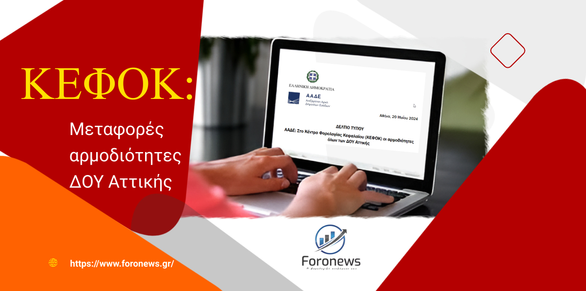 Ειδικότερα, σήμερα, 20/5/2024, μεταφέρονται στο ΚΕΦΟΚ Αττικής οι αρμοδιότητες φορολογίας μεταβίβασης περιουσίας και κατοχής ακινήτων των ΔΟΥ: ΙΓ’ Αθηνών, Αγίων Αναργύρων, Γλυφάδας, Ηλιούπολης, Καλλιθέας, Νέας Ιωνίας, Α΄ Πειραιά, Ε’ Πειραιά, Νίκαιας και Περιστερίου.