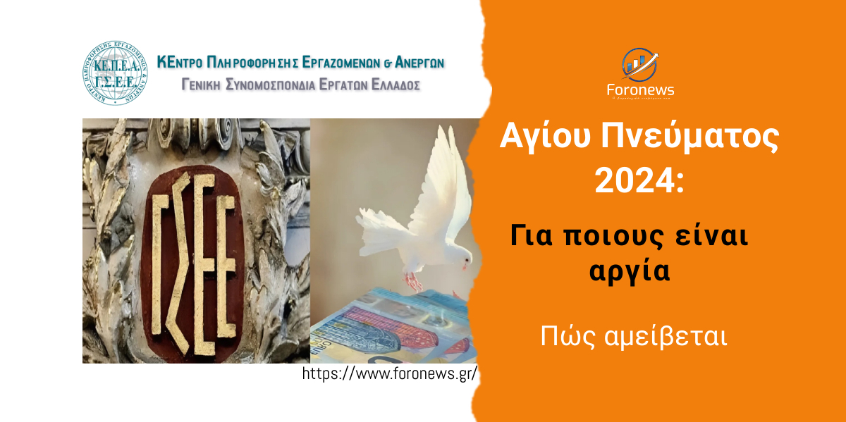 H ΓΣΕΕ, μέσω του Κέντρου Πληροφόρησης Εργαζομένων & Ανέργων της Συνομοσπονδίας (ΚΕ.Π.Ε.Α./ΓΣΕΕ), www.kepea.gr ενημερώνει τους μισθωτούς του ιδιωτικού τομέα για τη Δευτέρα 24 Ιουνίου 2024 (Αγίου Πνεύματος).
