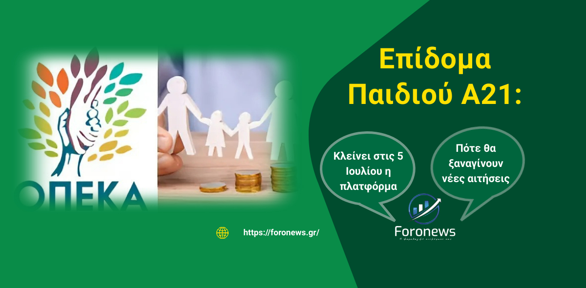 Το Υπουργείο Κοινωνικής Συνοχής και Οικογένειας, με τον εποπτευόμενο Οργανισμό Επιδομάτων και Κοινωνικής Αλληλεγγύης (ΟΠΕΚΑ), ενημερώνουν ότι, η ηλεκτρονική πλατφόρμα Α21 – Επίδομα Παιδιού, κλείνει προσωρινά, την Παρασκευή 5.7.2024 στις 15.00.