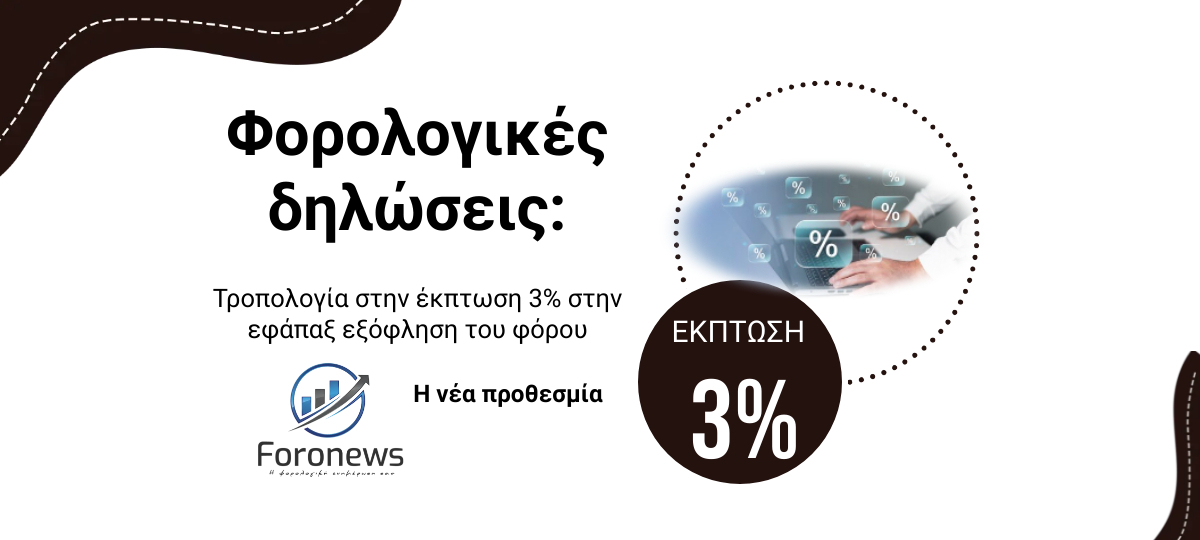 Όταν ο φόρος εισοδήματος φυσικών προσώπων φορολογικού έτους 2023 καταβάλλεται εφάπαξ μέχρι την καταληκτική ημερομηνία καταβολής της πρώτης δόσης, παρέχεται στο συνολικό ποσό του φόρου και των συμβεβαιούμενών με αυτόν οφειλών, έκπτωση τρία τοις εκατό (3%).