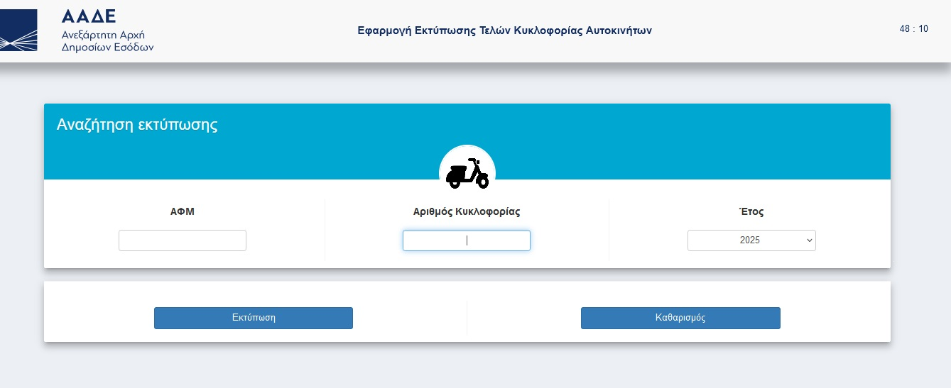 → myAADE > Εφαρμογές > Φορολογικές Υπηρεσίες > Οχήματα > Τέλη κυκλοφορίας χωρίς κωδικούς TAXISnet > Είσοδος στην Εφαρμογή, καταχωρώντας τον ΑΦΜ και τον αριθμό κυκλοφορίας του οχήματος.