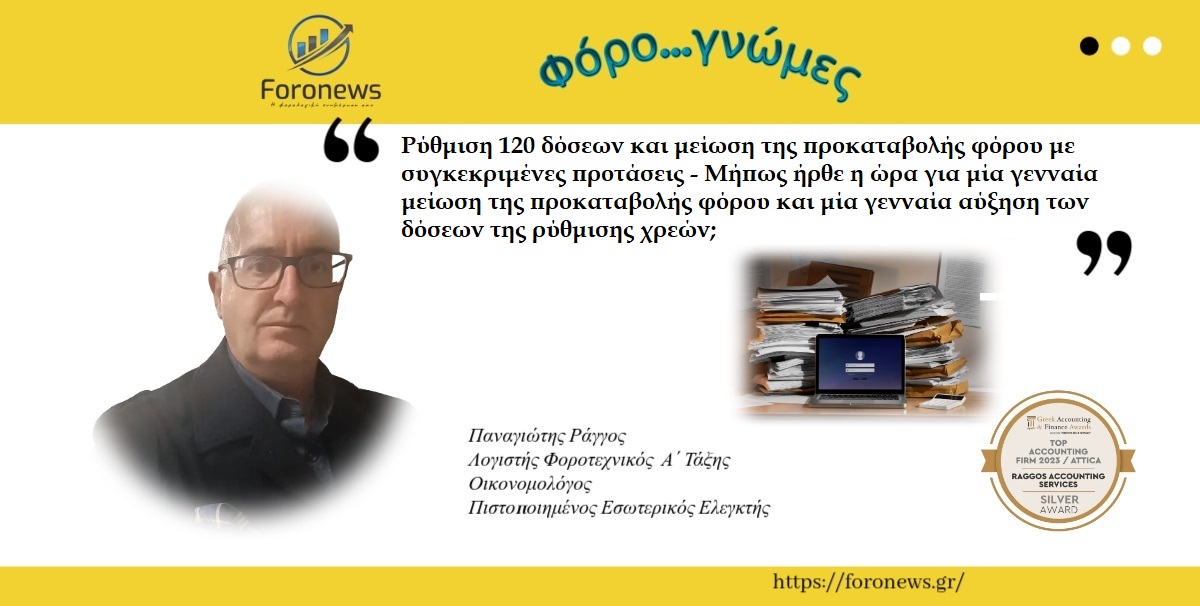 Φόρο...γνώμες: Ρύθμιση 120 δόσεων και μείωση της προκαταβολής φόρου με συγκεκριμένες προτάσεις - Μήπως ήρθε η ώρα για μία γενναία μείωση της προκαταβολής φόρου και μία γενναία αύξηση των δόσεων της ρύθμισης χρεών; Νέα Επικαιρότητα Η συσσώρευση ληξιπρόθεσμων οφειλών προς την ΑΑΔΕ και τον ΕΦΚΑ, που υπερβαίνουν συνολικά τα 110 δισ. ευρώ, αποτελεί διαχρονικό πρόβλημα για την ελληνική οικονομία. Από αυτά, σημαντικό ποσοστό αφορά μικρομεσαίες επιχειρήσεις και ελεύθερους επαγγελματίες, οι οποίοι αδυνατούν να ανταποκριθούν στις υφιστάμενες ρυθμίσεις περιορισμένων δόσεων. Παράλληλα, η προκαταβολή φόρου εισοδήματος, που φτάνει έως και το 100%, στερεί κρίσιμη ρευστότητα από την πραγματική οικονομία. 1. Πρόταση για επαναφορά της ρύθμισης των 120 δόσεων Η επαναφορά της ρύθμισης των έως 120 δόσεων κρίνεται αναγκαία με συγκεκριμένους και ρεαλιστικούς όρους: ■ Προτεινόμενο πλαίσιο: Ένταξη οφειλών προς ΑΑΔΕ και ΕΦΚΑ που έχουν βεβαιωθεί έως συγκεκριμένη ημερομηνία (π.χ. 31/12 του προηγούμενου έτους). Μέγιστος αριθμός: 120 μηνιαίες δόσεις. Ελάχιστη μηνιαία δόση: > 30 € για φυσικά πρόσωπα, > 50 € για επιχειρήσεις. > Επιτόκιο ρύθμισης έως 3% ετησίως (χαμηλότερο από τις πάγιες ρυθμίσεις). > Δυνατότητα επανένταξης για όσους έχασαν παλαιότερες ρυθμίσεις, με: > προκαταβολή 5%–10% της οφειλής ή > καταβολή 2–3 δόσεων ως προϋπόθεση ενεργοποίησης. ■ Ενδεικτικό παράδειγμα Οφειλή 12.000 €: Σε 24 δόσεις → 500 € / μήνα (ανέφικτο). Σε 120 δόσεις → 100 € / μήνα, ποσό ρεαλιστικό και βιώσιμο. Η εμπειρία δείχνει ότι τέτοιες ρυθμίσεις αυξάνουν τη συμμόρφωση και οδηγούν σε πραγματική είσπραξη εσόδων, αντί για διαρκή διόγκωση ανεπίδεκτων χρεών. 2. Πρόταση για μείωση της προκαταβολής φόρου Η προκαταβολή φόρου στο 80%–100% επιβαρύνει δυσανάλογα επαγγελματίες με χαμηλή ή ασταθή κερδοφορία. Προτείνεται: Μείωση της προκαταβολής φόρου: στο 50% για ελεύθερους επαγγελματίες και ατομικές επιχειρήσεις, στο 60% για μικρές και πολύ μικρές επιχειρήσεις. Πρόσθετη μείωση στο 30% για: > νέες επιχειρήσεις έως 5 ετών, επιχειρήσεις με κύκλο εργασιών έως 50.000 €. > Δυνατότητα εκκαθάρισης της προκαταβολής στο τέλος του επόμενου έτους με βάση τα πραγματικά αποτελέσματα. ■ Ενδεικτικό παράδειγμα Φόρος εισοδήματος 4.000 €: Σήμερα: φόρος 4.000 € + προκαταβολή 4.000 € = 8.000 € Με προκαταβολή 50%: 4.000 € + 2.000 € = 6.000 € → Άμεση ενίσχυση ρευστότητας 2.000 €. 3. Συνδυαστικό όφελος για οικονομία και Δημόσιο Ο συνδυασμός 120 δόσεων και μειωμένης προκαταβολής: μειώνει τα νέα ληξιπρόθεσμα, αυξάνει τη συνέπεια πληρωμών, στηρίζει τη βιωσιμότητα μικρών επιχειρήσεων, ενισχύει την απασχόληση, οδηγεί σε σταθερότερα και μακροπρόθεσμα δημόσια έσοδα. ■ Συμπέρασμα Η επαναφορά της ρύθμισης των 120 δόσεων και η ουσιαστική μείωση της προκαταβολής φόρου δεν αποτελούν παροχές, αλλά αναγκαία εργαλεία οικονομικής σταθερότητας και δικαιοσύνης. Με ξεκάθαρους αριθμούς και στοχευμένα κριτήρια, μπορούν να εφαρμοστούν άμεσα προς όφελος τόσο των φορολογουμένων όσο και του Δημοσίου. Μήπως ήρθε η ώρα για μία γενναία μείωση της προκαταβολής φόρου και μία γενναία αύξηση των δόσεων της ρύθμισης χρεών; Τα συμπεράσματα δικά σας... Παναγιώτης Ράγγος Λογιστής Φοροτεχνικός Α΄ Τάξης - Οικονομολόγος Πιστοποιημένος Εσωτερικός Ελεγκτής Previous Next