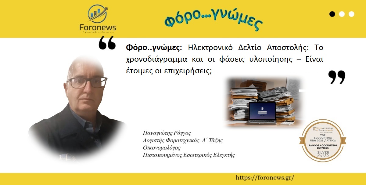 Φόρο..γνώμες: Ηλεκτρονικό Δελτίο Αποστολής: Το χρονοδιάγραμμα και οι φάσεις υλοποίησης – Είναι έτοιμες οι επιχειρήσεις; Η υποχρεωτική εφαρμογή των ψηφιακών δελτίων αποστολής θα γίνει σε δύο φάσεις. Οι φάσεις υλοποίησης του χρονοδιαγράμματος Σύμφωνα με το χρονοδιάγραμμα που γνωρίζουμε αυτή τη στιγμή, η πρώτη φάση ξεκινά την 1η Δεκεμβρίου του 2024 για μια μεγάλη κατηγορία επιχειρήσεων. Σε αυτό το βήμα γίνονται ψηφιακές οι παρακάτω βασικές λειτουργίες: Έκδοση παραστατικών. διαβίβαση παραστατικών διακίνησης στο myDATA (μέσω Παρόχου, μέσω ERP, ή μέσω της εφαρμογής timologio) πριν την έναρξη διακίνησης των αγαθών. Λήψη ΜΑΡΚ και κωδικού QR από την ΑΑΔΕ. Αυτόματη ενημέρωση παραλήπτη για την έκδοση και διαβίβαση των παραστατικών διακίνησης μέσω σχετικών μεθόδων. Οι παραπάνω λειτουργίες θα επιτρέψουν την απλοποίηση των ελέγχων στον δρόμο, οι οποίοι θα πραγματοποιούνται απλά με τη σάρωση του QR Code. Μέσω της σάρωσης των παραστατικών διακίνησης διενεργείται επιβεβαίωση δεδομένων από την έναρξη έως και την ολοκλήρωση της διακίνησης, ενώ πλέον θα είναι δυνατή και η συσχέτιση Δελτίων Αποστολής με Τιμολόγια Πώλησης στα παραστατικά με σκοπό διακίνησης "Πώληση". Η επόμενη φάση ξεκινά στις αρχές του 2025. Η Β’ φάση φέρνει την ψηφιοποίηση των παρακάτω διαδικασιών: Επιβεβαίωση παραλαβής από τον μεταφορέα κατά τη φόρτωση. Παρακολούθηση των μεταφορτώσεων και εν γένει των αλλαγών μεταφορικού μέσου. Παρακολούθηση πιθανής ζύγισης ποσότητας σε περίπτωση που η ζύγιση γίνεται μετά την έναρξη της διακίνησης. Επιβεβαίωση παραλαβής από τον λήπτη. Υποχρέωση διαβίβασης τυχόν αποκλίσεων ποσοτήτων στη myDATA. Δυνατότητα διαβίβασης διορθώσεων από τον αποστολέα για τα παραστατικά διακίνησης σε περίπτωση αποδοχής των αποκλίσεων. Σε ποιους κλάδους γίνεται υποχρεωτικό το ψηφιακό ΔΑ μέσα στο 2024 Η υιοθέτηση των Ψηφιακών Δελτίων Αποστολής γίνεται υποχρεωτική σε μερίδα επιχειρήσεων, με βάση κριτήρια που αφορούν στο μέγεθος και στον τομέα δραστηριότητας. Από την 1η Δεκεμβρίου 2024 το Ψηφιακό Δελτίο Αποστολής γίνεται υποχρεωτικό για: Επιχειρήσεις με ακαθάριστα έσοδα πάνω από διακόσιες χιλιάδες ευρώ (200.000 €), καθώς και Επιχειρήσεις, ανεξαρτήτως ύψους ακαθαρίστων εσόδων, που δραστηριοποιούνται στους τομείς: Ενεργειακών προϊόντων (καύσιμα). Φαρμακευτικών προϊόντων και ιατρικών αναλωσίμων. Οικοδομικών υλικών. Παραγωγής, τυποποίησης και εμπορίας ελαιόκαρπου και ελαιόλαδου. Όσες επιχειρήσεις δεν εντάσσονται στις παραπάνω κατηγορίες πρέπει να υιοθετήσουν υποχρεωτικά τα Ψηφιακά Δελτία Αποστολής από 1 Απριλίου 2025. → Το δημόσιο από την 1η Ιανουαρίου 2026 (πάντα με τα σημερινά δεδομένα) θα πρέπει και εκείνο να εκδίδει ηλεκτρονικά τα δελτία του. Είναι έτοιμες οι επιχειρήσεις; Καταρχάς στην ‘Α Φάση (1/12), η επιχείρηση εκδότης έχει υποχρέωση να εκδώσει το ηλεκτρονικό δελτίο αποστολής για την διακίνηση των αγαθών ή εμπορευμάτων → Το δελτίο πάει στην πλατφόρμα myData → o λήπτης δεν κάνει κάτι άλλο από τον να κάνει τον προβλεπόμενο έλεγχο ποιοτικό και ποσοτικό που έκανε μέχρι σήμερα. Στη Β’ Φάση όμως έχουμε να αντιμετωπίσουμε διάφορα θέματα. Συγκεκριμένα: Ο εκδότης εκδίδει το παραστατικό → Παρακολουθεί το παραστατικό με αποδοχές και σκαναρίσματα – ιδιαίτερα όταν υπάρχουν ενδιάμεσα, μεταφορικά μέσα με μεταφορτώσεις (σύνθετη διαδικασία), που θα πρέπει να ελέγχουν τα αγαθά ή εμπορεύματα → Ο τελικό