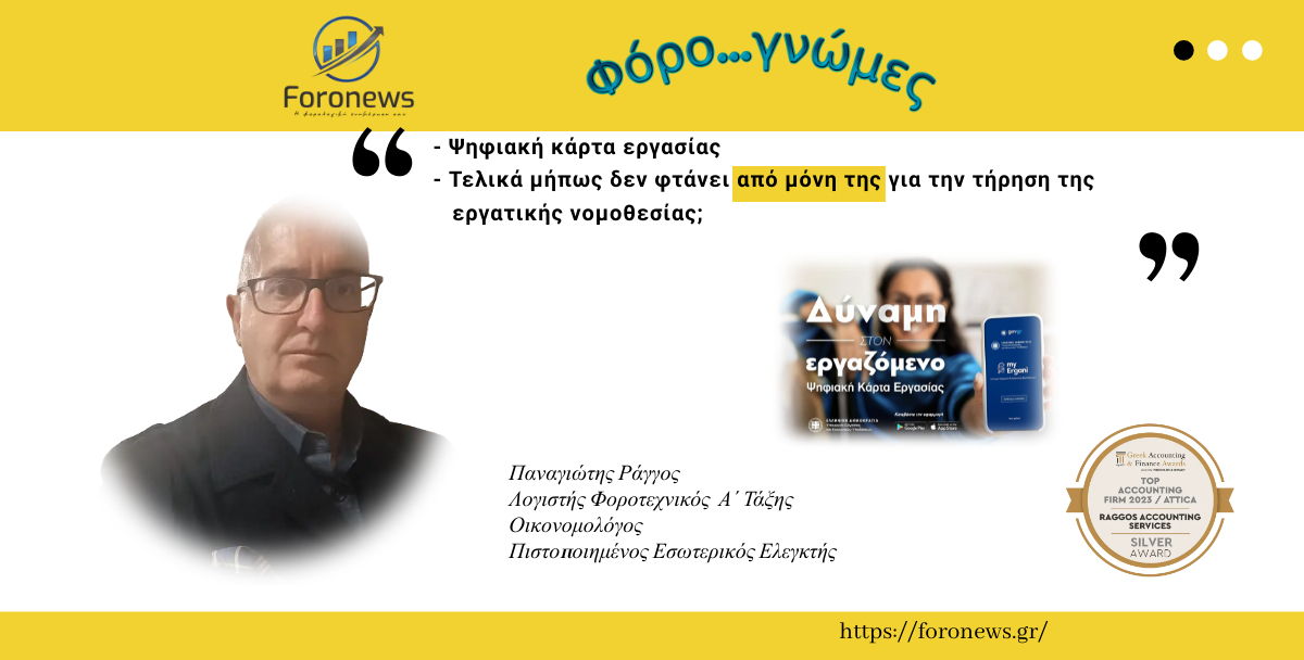 Φόρο...γνώμες: Ψηφιακή κάρτα εργασίας Τελικά μήπως δεν φτάνει από μόνη της για την τήρηση της εργατικής νομοθεσίας; Επανερχόμαστε ξανά για το θέμα της εφαρμογής της ψηφιακής κάρτας εργασίας στην ζωή των εργαζομένων και των επιχειρήσεων. Όπως είναι γνωστό μέσω της ψηφιακής κάρτας εργασίας δίνεται η δυνατότητα καταγραφής του πραγματικού ωραρίου εργασίας. Το σύστημα «Εργάνη» ενημερώνεται σε πραγματικό χρόνο για το ωράριο εργασίας των εργαζομένων και χαρακτηρίζει αυτόματα κάθε ώρα εργασίας ως κανονικό ωράριο – υπερεργασία, υπερωρία ή διευθέτηση, όπως επίσης τα διαλείμματα, τα ρεπό, τις άδειες, μεταξύ άλλων. Τελικά όμως με την εφαρμογή της λύθηκαν τα προβλήματα; Η χρήση από μόνη της φτάνει; Με την εφαρμογή της ψηφιακής κάρτας εργασίας στόχος ήταν να μπει φρένο στην παραβίαση του ωραρίου εργασίας, οι έλεγχοι ωστόσο των κλιμακίων της Επιθεώρησης Εργασίας δεν ικανοποίησαν τις προσδοκίες αυτές, καθώς και πάλι καταγράφεται καταστρατήγηση της εργατικής νομοθεσίας. Τα στοιχεία που δόθηκαν στη δημοσιότητα επιβεβαιώνουν ότι η χρήση της ψηφιακής κάρτας εργασίας, δεν εμπόδισε, ούτε άλλαξε κάτι στις συνήθεις εργοδοτικές πρακτικές: Το ωράριο εργασίας παραβιάζεται συστηματικά, ενώ οι εργαζόμενοι καλούνται να δουλέψουν απλήρωτες υπερωρίες. ■ Τι δείχνουν τα ευρήματα των ελέγχων Σύμφωνα τα ευρήματα των ελέγχων εργαζόμενοι υποχρεώνονται να δουλεύουν απλήρωτοι υπερωρίες, ενώ άλλοι που έχουν δηλωθεί για «μερική απασχόληση» (4ωρο) εντοπίστηκαν να εργάζονται 8 ή ακόμα και 12 ώρες. Σύμφωνα με τους ελεγκτές της Επιθεώρησης Εργασίας σχεδόν 1.000 επιχειρήσεις (που δραστηριοποιούνται κυρίως σε υπηρεσίες και εμπόριο) και εφαρμόζουν την ψηφιακή κάρτα εργασίας πιάστηκαν να παραβιάζουν το ωράριο εργασίας. Συγκεκριμένα εντοπίστηκαν τουλάχιστον 930 επιχειρήσεις που παραβίασαν την ορθή χρήση της ψηφιακής κάρτας εργασίας, στις οποίες επιβλήθηκαν μάλιστα πρόστιμα συνολικού ύψους 2,6 εκατ. ευρώ πανελλαδικά. Επίσης συνολικά, οι περιπτώσεις που αφορούν «υπερβάσεις ωραρίων και συμβάσεις εργασίας» το πρώτο 6μηνο του 2024 έφτασαν συνολικά τις 3.349, αποτελώντας περισσότερο από το 40% του συνόλου των παραβάσεων. Τελικά, όπως το έχουμε ξανατονίσει, η εφαρμογή από μόνη της δεν φτάνει. Θα πρέπει να υπάρχουν συνεχείς έλεγχοι για την τήρηση της εργατικής νομοθεσίας. Για να γίνει αυτό θα πρέπει να υπάρχει επαρκής στελέχωση των ελεγκτικών υπηρεσιών. Πίσω από τα προγράμματα πρέπει να υπάρχουν άνθρωποι που αξιολογούν, κρίνουν και αποφασίζουν. Αυτή είναι η βασική διαφορά του ανθρώπου και της μηχανής. "Έχω μετατραπεί σε ένα είδος μηχανής που αλέθει δεδομένα και βγάζει συμπεράσματα" - Κάρολος Δαρβίνος Τα συμπεράσματα δικά σας... Παναγιώτης Ράγγος Λογιστής Φοροτεχνικός Α΄ Τάξης Οικονομολόγος Πιστοποιημένος Εσωτερικός Ελεγκτής Previous Next