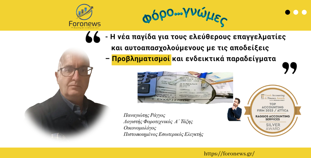 Φόρο..γνώμες: Η νέα παγίδα για τους ελεύθερους επαγγελματίες και αυτοαπασχολούμενους με τις αποδείξεις – Προβληματισμοί και ενδεικτικά παραδείγματα Το σημερινό άρθρο θα ασχοληθεί ξανά με το θέμα της συλλογής των αποδείξεων των ελεύθερων επαγγελματιών και αυτοαπασχολούμενων μετά τα νέα δεδομένα που επέφερε η ψήφιση στη Βουλή του νέου φορολογικού νομοσχεδίου τον Δεκέμβριο του 2023. Με συνεχή αρθρογραφία προσπαθούμε να ενημερώσουμε για όλες τις πτυχές του νέου φορολογικού νομοσχεδίου και συγκεκριμένα με τον νέο τεκμαρτό τρόπο υπολογισμού. Η βάση υπολογισμού είναι το ποσό των 10.920 ευρώ προσαυξανόμενο με τριετίες (10% έως 30% η τριετία), προσαύξηση λόγω τζίρου (5%), προσαύξηση προσωπικού (10%) κτλ. Οι νέες αλλαγές που θα εφαρμοστούν αναδρομικά από έτος (2023) και οι φόροι θα φανούν στα νέα εκκαθαριστικά που θα υποβληθούν έως την 26 Ιουλίου 2024 (με τις ισχύουσες προθεσμίες). Μία παγίδα πρόσθετης επιβάρυνσης, πέραν του αυξημένου φόρου που θα κληθούν να πληρώσουν οι ελεύθεροι επαγγελματίες και αυτοαπασχολούμενοι, είναι η συλλογή των αποδείξεων που θα πρέπει να έχουν συγκεντρώσει μέχρι το τέλος του έτους και συγκεκριμένα έως την 31η Δεκεμβρίου 2023. Μέχρι και το έτος 2022, το σύνολο των αποδείξεων που όφειλαν να προσκομίσουν οι ελεύθεροι επαγγελματίες και αυτοαπασχολούμενοι υπολογιζόταν με βάση το ύψος των καθαρών κερδών που δήλωναν. Πλέον από το έτος 2023 όμως, θα υπολογίζονται στο τεκμαρτό εισόδημα, όπως αυτό ορίζεται μετά την ψήφιση του νέου φορολογικού νομοσχεδίου, όταν αυτό είναι υψηλότερο. Υπερτερεί δηλαδή το τεκμαρτό του πραγματικού εισοδήματος. Επομένως, σε περίπτωση που το τεκμαρτό εισόδημα υπερτερεί του πραγματικού, υψηλότερα θα είναι και τα ποσά των αποδείξεων που θα πρέπει να έχουν συγκεντρώσει με ηλεκτρονικό τρόπο. Σύμφωνα με την ισχύουσα νομοθεσία, κάθε φορολογούμενος που είναι μισθωτός, συνταξιούχος, κατά κύριο επάγγελμα αγρότης ή αυτοαπασχολούμενος καθώς και κάθε φορολογούμενος με εισοδήματα από ενοίκια ακινήτων πρέπει να έχει πραγματοποιήσει έως το τέλος του έτους 2023, δαπάνες για αγορές αγαθών και παροχή υπηρεσιών συνολικού ύψους ίσου με ποσοστό 30% του ετήσιου ατομικού πραγματικού εισοδήματός του. Ø Παραδείγματα 1. Έστω ελεύθερος επαγγελματίας δήλωσε το έτος 2023 εισόδημα βάση των βιβλίων του 8.000 ευρώ. Αν υποθέσουμε ότι τα ίδια ήταν τα εισοδήματά του το 2022, θα έπρεπε να συγκεντρώσει αποδείξεις 2.400 ευρώ (8.000 Χ 30%). Έστω στο παράδειγμά μας ο ελεύθερος επαγγελματίας ασκεί τη δραστηριότητα 20 έτη και δεν έχει προσωπικό, τότε με βάση τον νέο τρόπο υπολογισμού θα πρέπει να δηλώσει εισοδήματα 10.920 + 3.614,52 (30% προσαύξηση 3 τριετιών). Σύνολο εισοδήματος 14.534,52 ευρώ. Με βάση το ποσό των 14.534,52 ευρώ, θα πρέπει να συγκεντρώσει αποδείξεις 4.360 ευρώ. Επομένως μέσα σε 1 μήνα θα έπρεπε να «τρέξει» ώστε να συλλέξει επιπλέον αποδείξεις 1.960 ευρώ (4.360 – 2.400). Αν δεν μπορέσει να τις «μαζέψει», θα πληρώσει πέναλτι φόρου 431 ευρώ (1.960 Χ 22%). 2. Έστω αυτοαπασχολούμενος δηλώνει βάσει των βιβλίων του κέρδη 25.000 ευρώ και τζίρο 40.000 ευρώ. Έχει 20 έτη λειτουργίας και απασχολεί ένα άτομο με ετήσιες αποδοχές 12.000. Για ευκολία δεν θα υπολογίσουμε τζίρο με βάση τον ΚΑΔ. Έστω το 2022 είχε τα ίδια εισοδήματα. Θα έπρεπε να είχε συγκεντρώσει αποδείξεις 7.500 ευρώ. Με τον νέο τρόπο υπολογισμού το εισόδημα διαμορφώνεται ως εξής: Έχουμε 10.920 (βάση υπολογισμού) + 3.614,52 (30% προσαύξηση 3 τριετιών) + 1.200 (προσαύξηση 