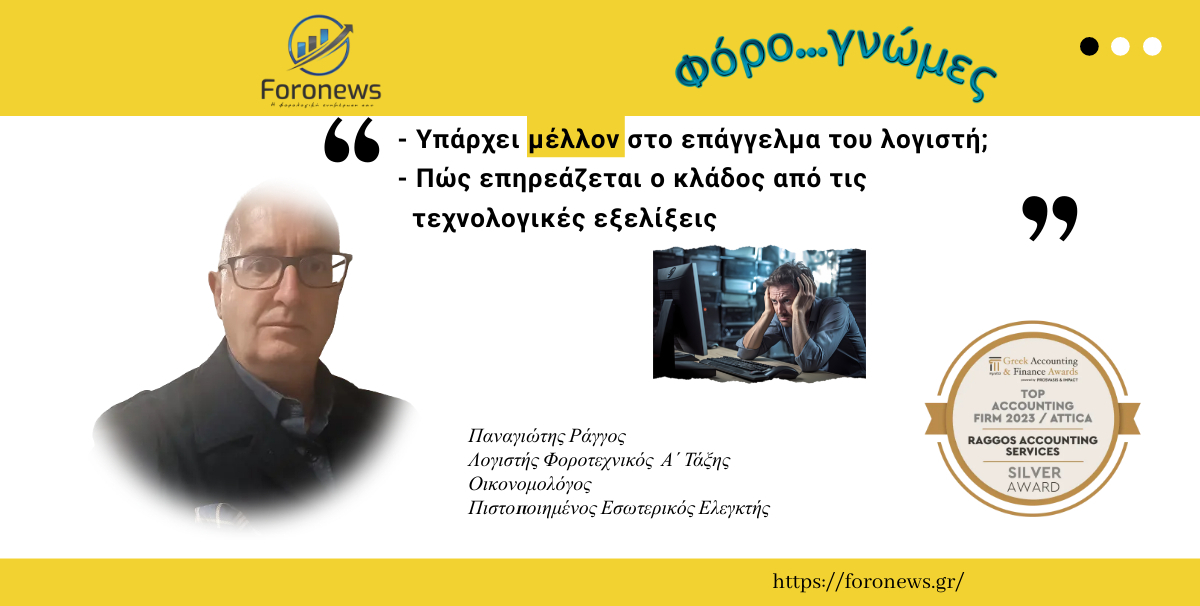 Φόρο..γνώμες: Υπάρχει μέλλον στο επάγγελμα του λογιστή; - Πώς επηρεάζεται ο κλάδος από τις τεχνολογικές εξελίξεις Ένας λογιστής είναι ο άνθρωπος που ασχολείται επαγγελματικά με τη λογιστική, η οποία μετράει, αποκαλύπτει ή διασφαλίζει εκείνες τις οικονομικές πληροφορίες που βοηθούν τους διευθυντές, τους επενδυτές, τις φορολογικές αρχές και άλλους να αποφασίζουν σχετικά με την κατανομή των πόρων. Ο επαγγελματίας λογιστής έχει ορισμένες αρμοδιότητες από τον νόμο, όπως τη δυνατότητα να πιστοποιεί τις οικονομικές καταστάσεις του εκάστοτε οικονομικού οργανισμού, και μπορεί να θεωρηθεί υπεύθυνος για αυτές για οποιοδήποτε παράπτωμα που αυτές φέρουν. Γιατί όμως ξεκινήσαμε με τον ορισμό του λογιστή; To επάγγελμα του λογιστή έχει αλλάξει ριζικά τα τελευταία χρόνια. Οι εργασίες με τις οποίες ασχολείται ένας επαγγελματίας μάχιμος λογιστής, είναι πολύ περισσότερες και με πάρα πολλές ευθύνες και υποχρεώσεις. Πού οδηγείται όμως αυτό το επάγγελμα και ο κλάδος γενικότερα; Πόσο θα επηρεάσουν το επάγγελμα οι νέες αλλαγές στην τεχνολογία; Πόσο θα επηρεάσουν το επάγγελμα οι συνεχόμενες αλλαγές στη νομοθεσία από την είσοδο των νέων τεχνολογιών και της ψηφιοποίησης; Σημαντική επιρροή έχει ο ψηφιακός μετασχηματισμός στον λογιστικό κλάδο, καθώς οι τεχνολογικές εξελίξεις απαλλάσσουν τους επαγγελματίες του τομέα από καθήκοντα ρουτίνας, συρρικνώνουν το περιθώριο λάθους και μειώνουν τις απάτες και το κόστος. Όσον αφορά τις τεχνολογικές εξελίξεις, μεγαλύτερη βαρύτητα δίνεται στο εξειδικευμένο λογιστικό λογισμικό, ενώ ακολουθούν η ενοποίηση εφαρμογών, η αυτοματοποίηση των εργασιών, η εξαγωγή χρήσιμων πληροφοριών και τα συστήματα που βασίζονται στο cloud. Σε μεγάλο βαθμό οι επαγγελματίες του κλάδου δηλώνουν ανήσυχοι για τις προκλήσεις που θα έχουν να αντιμετωπίσουν, κυρίως σε ότι αφορά την τήρηση προθεσμιών συμμόρφωσης, την υποχρεωτική διαβίβαση των παραστατικών στη πλατφόρμα mydata και την αυστηροποίηση των κανονισμών συμμόρφωσης στις επιχειρήσεις των πελατών τους που έμμεσα και άμεσα επηρεάζουν και τους ίδιους (Ν.4557/2018 για το ξέπλυμα μαύρου χρήματος). Μάλιστα σε έρευνα της Πανελλήνιας Ένωσης Λογιστών Οικονομολόγων (ΠΑΕΛΟ) αυτές οι ανησυχίες φαίνονται καθαρά. Παραθέτουμε το link με την διαδικτυακή συζήτηση που μεταδόθηκε ζωντανά στο κανάλι της ΠΑΕΛΟ την Δευτέρα 27/5/2024 για να το δείτε: https://www.facebook.com/732052517/videos/377944041956675/ Ø Τι έχει γίνει όμως τα τελευταία χρόνια; Την τελευταία δεκαετία και ιδιαίτερα από το 2016 και μετά το επάγγελμα του λογιστή έχει αλλάξει ριζικά. Έχουν προστεθεί στα λογιστικά γραφεία και τους λογιστές ιδιαίτερα μεγάλος όγκος εργασιών. Νέες πλατφόρμες κάθε είδους, ψηφιοποίηση των υπηρεσιών, myData, ΕΡΓΑΝΗ Ι και ΕΡΓΑΝΗ ΙΙ, oνόμος 4557/2018 για το ξέπλυμα χρήματος κ.ά. Ιδιαίτερα να θυμίσουμε την περίοδο του covidτο λογιστικό επάγγελμα και οι λογιστές ήταν αυτοί που συνέβαλαν να κρατηθεί η οικονομία σε λειτουργία. Ο λογιστής ήταν μαζί με τους νοσηλευτές και τους γιατρούς από τα λίγα επαγγέλματα που έβαλαν «πλάτη». Εκτιμήθηκε; Θεωρούμε εκ΄ του αποτελέσματος πως όχι. Δυστυχώς με ευθύνη κυρίως του κλάδου μας δεν πετύχαμε πράγματα για εμάς. Θα θυμίσουμε εδώ το θέμα της ασθένειας. Ο λογιστής στην ουσία ποτέ δεν μπορεί να αρρωστήσει. Είναι ένα ρομπότ που πρέπει να δουλεύει συνεχώς. Δεν υπάρχει άδεια. Θυμίζουμε ότι τον Αύγουστο που τα πάντα νεκρώνουν (κλειστή η 