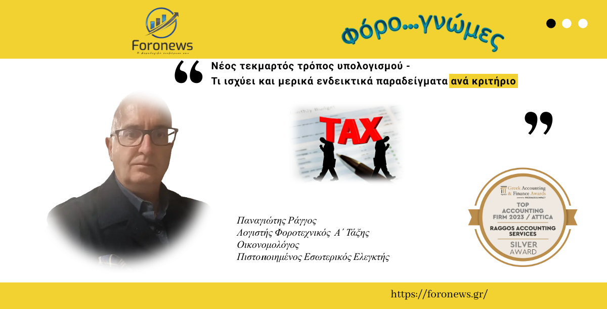 Φόρο..γνώμες: Νέος τεκμαρτός τρόπος υπολογισμού - Τι ισχύει και μερικά ενδεικτικά παραδείγματα ανά κριτήριο Με το νέο ν. 5073/2023, το τεκμαρτό σύστημα παραμένει και επιδιώκει να προσδιορίσει με άμεσο πλέον τρόπο το (ελάχιστο) εισόδημα του ελεύθερου επαγγελματία και να το φορολογήσει. Σε αυτό το πλαίσιο, λαμβάνεται ως βάση υπολογισμού το υψηλότερο από τα ακόλουθα 2: είτε ο ετήσιος βασικός/κατώτατος μισθός, με συνδυαστική εφαρμογή συντελεστών προσαύξησης ή οι ετήσιες μεικτές αποδοχές του υψηλότερα αμειβόμενου υπαλλήλου που απασχολείται από τον υπόχρεο ελεύθερο επαγγελματία. Το παραπάνω ποσό επιβαρύνεται από συντελεστές προσαύξησης οι οποίοι σχετίζονται με την ετήσια δαπάνη μισθοδοσίας (αν απασχολούνται υπάλληλοι) καθώς και τα κλαδικά στοιχεία του κύκλου εργασιών. Σύμφωνα με τη νομοθεσία, για τα τρία πρώτα χρόνια από την έναρξη της δραστηριότητάς τους δεν εφαρμόζεται ο τεκμαρτός τρόπος υπολογισμού του φορολογητέου εισοδήματος. Με βάση το νέο πλαίσιο, από τον τεκμαρτό τρόπο υπολογισμού εξαιρούνται όσοι προχώρησαν σε έναρξη εργασιών το 2021, το 2022 ή το 2023. Όσοι έκαναν έναρξη εργασιών το 2021 θα είναι η τελευταία χρονιά της εξαίρεσης. Μετά τα τρία χρόνια λειτουργίας και συγκεκριμένα τον τέταρτο χρόνο, θα φορολογηθούν με τεκμαρτό εισόδημα μειωμένο κατά 67%, τον πέμπτο 33% μειωμένο, ενώ τον έκτο χρόνο το τεκμαρτό εισόδημα θα φτάσει τα 10.920 ευρώ. Αυτό το ποσό των 10.920 ευρώ ισχύει με βάση τον κατώτατο μικτό μηνιαίο μισθό ενός εργαζομένου με βάση την τελευταία ΕΓΣΣΕ (780 ευρώ Χ 14 μήνες). Στο σημείο αυτό θα τονίσουμε ότι από την 1η Απριλίου 2024 το κατώτατο ποσό αναπροσαρμόστηκε στο ποσό των 830 ευρώ μηνιαίος, οπότε μένει να δούμε τι θα ισχύσει το 2024 ως προς την τεκμαρτή φορολόγηση. Η αναπροσαρμογή αυτή επιφέρει αύξηση στο ποσό και συγκεκριμένα πλέον διαμορφώνεται σε 11.620 ευρώ (830 ευρώ Χ 14 μήνες). Αυτό όμως θα μας απασχολήσει από την επόμενη χρονιά. Οι νέοι επιτηδευματίες θα πρέπει να συμπληρώσουν τον κωδικό 017-018 της φορολογικής δήλωσης για να κερδίσουν μείωση κατά 50% στον ελάχιστο φορολογικό συντελεστή. Δηλαδή ο συντελεστής από το 9% μειώνεται στο 4,5%, με την προϋπόθεση ότι το ετήσιο ακαθάριστο εισόδημα που προέρχεται από την επιχειρηματική δραστηριότητα ήταν το 2023 μέχρι 10.000 ευρώ. Όσοι θα υποβάλουν για πρώτη φορά φορολογική δήλωση με εισόδημα από επιχειρηματική δραστηριότητα θα κερδίσουν μείωση κατά 50% στην προκαταβολή φόρου. Επίσης, μόνο για το 2023 οι επαγγελματίες που θα φορολογηθούν για τα φετινά εισοδήματα με το τεκμήριο θα πληρώσουν το 2024 μειωμένη κατά 50% προκαταβολή φόρου. Οι νέοι επαγγελματίες δεν θα πληρώνουν φέτος τέλος επιτηδεύματος και για τα επόμενα τέσσερα χρόνια της δραστηριότητάς τους. Σημειώνεται ότι με την εκκαθάριση των φετινών φορολογικών δηλώσεων οι επαγγελματίες που θα φορολογηθούν με το νέο σύστημα των τεκμηρίων θα διαπιστώσουν ότι το τέλος επιτηδεύματος έχει «κουρευτεί» κατά 50%. Από 650 ευρώ θα κληθούν να πληρώσουν 325 ευρώ, ενώ για κάθε υποκατάστημα το τέλος έχει μειωθεί στα 300 ευρώ από 600 ευρώ. Με βάση τις επίσημες εξαγγελίες το τέλος επιτηδεύματος για τις ατομικές επιχειρήσεις και τους ελεύθερους επαγγελματίες θα καταργηθεί από το 2024 και δεν επιβαρυνθούν με τις φορολογικές δηλώσεις που θα υποβληθούν το 2025. Ø Τα υπόλοιπα κριτήρια → Το παραπάνω τεκμαρτό εισόδημα προσαυξάνεται κατά 10% του ποσού της ετήσιας δαπάνης μισθοδοσίας που τυχόν κ
