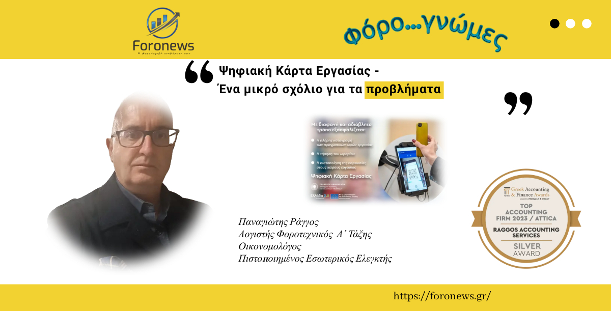 Φόρο...γνώμες: Ψηφιακή Κάρτα Εργασίας - Ένα μικρό σχόλιο για τα προβλήματα Η ψηφιακή κάρτα εργασίας είναι χρήσιμο βοηθητικό εργαλείο που όμως από μόνη της δεν λύνει τα προβλήματα της αδήλωτης εργασίας. Θα πρέπει να συνοδεύεται από εκτεταμένους ελέγχους του ΣΕΠΕ. ■ Τα προβλήματα Οι έλεγχοι που γίνονται είναι έλεγχοι ψηφιακοί, εξ αποστάσεως. Ο επιθεωρητής μπαίνει στο σύστημα και κοιτάζει αν συμφωνούν τα δηλωμένα προγράμματα των εργαζομένων στην Εργάνη ΙΙ με τα χτυπήματα της ψηφιακής κάρτας. Δεν γίνονται ελέγχοι διά ζώσης, να έλθει η Επιθεώρηση Εργασίας π.χ στο σουπερμάρκετ, να δει ποιοι είναι πράγματι μέσα και δουλεύουν κι αν έχουν χτυπήσει την κάρτα τους, ή ακόμη και αν γίνουν αυτοί οι έλεγχοι, είναι σπάνιοι. Στα σουπερμάρκετ, οι ταμίες χτυπάνε κάρτα στις 20.00 και να συνεχίζουν να δουλεύουν άλλα τρία τέταρτα για να εξυπηρετήσουν πελάτες και να κλείσουν ταμείο. Οι εργαζόμενοι στα κρέατα και τα τυριά έρχονται μιάμιση ώρα πριν για να ετοιμάσουν τον χώρο αλλά να μη χτυπάνε κάρτα κι αυτός ο χρόνος εργασίας να μην καταγράφεται πουθενά, οι τετράωροι και οι εξάωροι να χτυπούν κάρτα στο τετράωρο και το εξάωρο ενώ δουλεύουν οκτάωρο. Επίσης, όποιος καλείται να δουλέψει στο ρεπό του ή Κυριακή έχει παρατηρηθεί να μη χτυπάει κάρτα κ.ά. Στις Τράπεζες Χτυπάνε οι εργαζόμενοι κάρτα για προσέλευση στις 7.45 και για αποχώρηση στις 15.15 κι από εκεί και πέρα ο εργοδότης μπορεί και παρανομεί με δύο τρόπους: 1. Είτε λέει στον εργαζόμενο να βγει να χτυπήσει την κάρτα του στις 15.15 και να μπει μετά μέσα να συνεχίσει τη δουλειά του χωρίς να καταγράφονται η υπερεργασία και η υπερωρία. 2. Είτε ο εργοδότης αφήνει τον εργαζόμενο να χτυπήσει κανονικά την κάρτα στις 17.15, όμως δεν πληρώνει τις πρόσθετες ώρες δουλειάς. Καταγράφεται ψηφιακά πόσες ώρες δούλεψε αλλά δεν τις πληρώνεται..... Υπάρχουν και σε άλλους κλάδους προβλήματα με αυθαιρεσίες όπως στις υπηρεσίες καθαρισμού και φύλαξης. Και εκεί παρόμοια προβλήματα. Οι εργαζόμενοι δουλεύουν δωδεκάωρα, νυχτερινά, Σαββατοκύριακα και αργίες. Υπάρχουν εταιρείες που δεν έχουν βάλει καν ψηφιακή κάρτα εργασίας παρότι ήταν υποχρεωμένες, ενώ σε άλλες υπάρχει κάρτα αλλά χτυπιέται πάντα σε οκτάωρο, πενθήμερο και καθημερινές. Ετσι η εταιρεία εμφανίζεται νόμιμη ενώ οι εργαζόμενοι δεν πληρώνονται τίποτε, νυχτερινά, υπερωρίες, Κυριακές. Η λύση των εργαζομένων; Η καταγγελία. Είναι εύκολο; Όχι δεν είναι εύκολη υπόθεση. Κυριαρχεί ο φόβος. Οι εργαζόμενοι φοβούνται να κάνουν καταγγελία γιατί οι εταιρείες δεν ανανεώνουν τη σύμβαση σε όσους ζητούν τα λεφτά τους ή τους εκδικούνται μεταθέτοντάς τους σε άλλο πόστο δεκάδες χιλιόμετρα μακριά από το σπίτι τους ή ακόμη υπάρχουν και απειλές. Η ψηφιακή κάρτα εργασίας είναι ένα εργαλείο μέτρησης του ενεργού και του ανενεργού χρόνου των εργαζομένων. Όμως δεν αρκεί το χτύπημα μιας κάρτας για να λύσει τα προβλήματα. Χρειάζεται ενίσχυση της Επιθεώρησης Εργασίας. Υπάρχει βούληση για κάτι τέτοιο; Φαίνεται να μην υπάρχει η βούληση για ελέγχους. Όλα μέχρι σήμερα έχουν αφεθεί στην κάρτα. Τα προβλήματα τα καταγράφουμε με στόχο την επίλυσή τους. Ο χρόνος θα δείξει αν θα υπάρξουν αλλαγές. Τα συμπεράσματα δικά σας..... Παναγιώτης Ράγγος Λογιστής Φοροτεχνικός Α΄ Τάξης Οικονομολόγος Πιστοποιημένος Εσωτερικός Ελεγκτή Previous Next