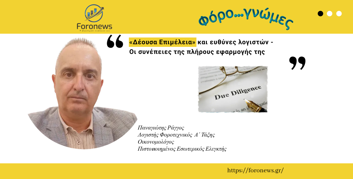 Φόρο..γνώμες: «Δέουσα Επιμέλεια» και ευθύνες λογιστών - Οι συνέπειες της πλήρους εφαρμογής της Το σημερινό μας άρθρο θα ασχοληθεί με το θέμα της «Δέουσας Επιμέλειας». Αφορμή για αυτό το άρθρο, στάθηκε η πληροφόρηση, ότι λογιστής κρίθηκε συνεργός για έκδοση και λήψη εικονικών παραστατικών, για υποβολή μη ορθών δηλώσεων ΦΠΑ, εισοδήματος και για μη τήρηση δέουσας επιμέλειας. Δεν μπορούμε να ξέρουμε αν τελικά ορθά ο λογιστής όντως είναι παράτυπος. Αυτό θα το δείξει η δικαιοσύνη. Το θέμα όμως είναι, ότι ο λογιστής δυστυχώς είναι εκτεθειμένος πλέον σε πολλά. Η δέουσα επιμέλεια ήρθε για να αναδείξει το πόσο ανοχύρωτος είμαστε ως κλάδος. Ας δούμε με λίγα λόγια τι είναι η δέουσα επιμέλεια και ποιες υποχρεώσεις απορρέουν από αυτήν. Δεν θα μπούμε στις λεπτομέρειες του νόμου. Άλλωστε αυτή υπάρχει παντού δημοσιευμένη και μπορεί ο κάθε συνάδελφος λογιστής και όχι μόνο (π.χ. επιχειρηματίας) να τον διαβάσει και να ενημερωθεί. Θα δώσουμε απλά μία μικρή εικόνα του νόμου και των επιπτώσεων. Ø Τι είναι η «Δέουσα Επιμέλεια» ; «Δέουσα Επιμέλεια» ή Due Diligence είναι η ολοκληρωμένη έρευνα που διεξάγεται από την επιχείρηση πριν την έναρξη μιας επιχειρηματικής συνεργασίας. Είναι, δηλαδή, μια διαδικασία και προσπάθεια συλλογής και ανάλυσης πληροφοριών πριν από τη λήψη μιας απόφασης. Χρησιμοποιείται συχνά από τους επενδυτές για την αξιολόγηση του κινδύνου της επιχειρηματικής κίνησης. Η διαδικασία αυτή δεν προβλέπεται κατ’ ανάγκη νομοθετικά, αλλά γίνεται με ευθύνη της επιχείρησης που επιθυμεί να προχωρήσει στην συνεργασία ή επένδυση, με τη σύμφωνη γνώμη της ελεγχόμενης εταιρείας. Σε κάποιες περιπτώσεις, ωστόσο, το Due Diligence είναι υποχρεωτικό εκ του νόμου. Ø Ποιες είναι οι περιπτώσεις υποχρέωσης Δέουσας Επιμέλειας; Σύμφωνα με τον Νόμο 4557/2018, όπως ισχύει μετά τις τροποποιήσεις του, τα υπόχρεα πρόσωπα εφαρμόζουν τα μέτρα δέουσας επιμέλειας ως προς τον πελάτη, όταν: συνάπτουν επιχειρηματική σχέση, διενεργούν περιστασιακή συναλλαγή που: ανέρχεται σε ποσό ίσο ή μεγαλύτερο των 15.000 ευρώ είτε η συναλλαγή αυτή πραγματοποιείται με μία και μόνη πράξη είτε με περισσότερες που φαίνεται να συνδέονται μεταξύ τους, αποτελεί μεταφορά χρηματικών ποσών, σύμφωνα με τον ορισμό του στοιχείου 9 του άρθρου 3 του Κανονισμού (ΕΕ) 2015/847 του Ευρωπαϊκού Κοινοβουλίου και του Συμβουλίου (ΕΕ L 141) άνω των 1.000 ευρώ, πρόκειται για πρόσωπα που εμπορεύονται αγαθά και διενεργούν περιστασιακή συναλλαγή σε μετρητά που αφορά σε ποσό 10.000 τουλάχιστον ευρώ, ανεξάρτητα από το αν διενεργείται με μία μόνη πράξη ή με περισσότερες που φαίνεται να συνδέονται μεταξύ τους, πρόκειται για παρόχους υπηρεσιών τυχερών παιγνίων που διενεργούν συναλλαγή που αφορά σε ποσό 2.000 τουλάχιστον ευρώ κατά την κατάθεση του στοιχήματος, την είσπραξη των κερδών ή και στις δύο περιπτώσεις, ανεξάρτητα από το αν η συναλλαγή διενεργείται με μία μόνη πράξη ή με περισσότερες που φαίνεται να συνδέονται μεταξύ τους, υπάρχει υπόνοια νομιμοποίησης εσόδων από εγκληματικές δραστηριότητες ή χρηματοδότησης της τρομοκρατίας, ανεξάρτητα από κάθε παρέκκλιση, εξαίρεση ή κατώτατο όριο ποσού, υπάρχουν αμφιβολίες για την ακρίβεια, την πληρότητα ή την επάρκεια των στοιχείων που συγκεντρώθηκαν προηγουμένως για την πιστοποίηση και την επαλήθευση της ταυτότητας του πελάτη ή του πραγματικού δικαιούχου. Υπάρχουν κατηγορίες δέουσας επιμέλειας όπως: 1. Α