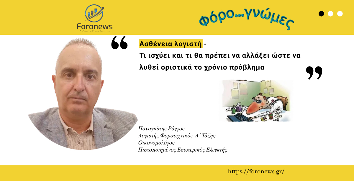 Φόρο..γνώμες: Ασθένεια λογιστή - Τι ισχύει και τι θα πρέπει να αλλάξει ώστε να λυθεί οριστικά το χρόνιο πρόβλημα Το σημερινό μας άρθρο θα ασχοληθεί με την ασθένεια του λογιστή. Συγκεκριμένα στο άρθρο 67 του Ν. 5042/2023 ρυθμίζεται η δυνατότητα παράτασης προθεσμιών υποβολής των φορολογικών και ασφαλιστικών δηλώσεων και καταστάσεων των λογιστών - φοροτεχνικών και των εντολέων - πελατών τους λόγω ασθένειας, τοκετού ή θανάτου του λογιστή. Το ερώτημα όμως είναι, μας καλύπτει; Η απάντηση είναι, σαφώς πως όχι. Ø Τι ισχύει σήμερα Άρθρο 67. Δυνατότητα παράτασης προθεσμιών υποβολής φορολογικών και ασφαλιστικών δηλώσεων και καταστάσεων, σε περίπτωση ασθένειας, τοκετού ή θανάτου λογιστή φοροτεχνικού 1. Σε περίπτωση που λογιστής - φοροτεχνικός νοσηλεύεται για διάστημα τουλάχιστον τριών (3) ημερών σε δημόσιο ή ιδιωτικό νοσοκομείο, λόγω ασθένειας ή τοκετού, που αποδεικνύεται από τα σχετικά έγγραφα του νοσοκομείου νοσηλείας του, οι προθεσμίες υποβολής των φορολογικών και ασφαλιστικών δηλώσεων και καταστάσεων του ιδίου και των εντολέων - πελατών του, οι οποίες λήγουν εντός του διαστήματος από την πρώτη (1η) μέχρι και την τριακοστή (30η), κατ' ανώτατο όριο, ημέρα νοσηλείας του, παρατείνονται μέχρι το τέλος του επόμενου μήνα από αυτόν της έκδοσης του εξιτηρίου, εφόσον η νοσηλεία δεν υπερβαίνει τις τριάντα (30) ημέρες ή μέχρι το τέλος του επόμενου μήνα από αυτόν εντός του οποίου συμπληρώθηκε νοσηλεία τριάντα (30) ημερών, για μεγαλύτερης διάρκειας νοσηλεία. 2. Η παρ. 1 ισχύει για τους εντολείς - πελάτες για τους οποίους ο λογιστής - φοροτεχνικός αποδεδειγμένα ήταν εξουσιοδοτημένος μέσω της ψηφιακής πύλης myAADE, ήδη κατά τον προηγούμενο μήνα της ημερομηνίας εισαγωγής του στο νοσοκομείο και παραμένει εξουσιοδοτημένος, σύμφωνα με τα στοιχεία της σχετικής εξουσιοδότησης. 3. Σε περίπτωση θανάτου λογιστή - φοροτεχνικού, οι προθεσμίες της παρ. 1 παρατείνονται μέχρι το τέλος του μεθεπόμενου μήνα από αυτόν του θανάτου. Ø Τα προβλήματα που επιζητούν λύσεις Το πρόβλημα δυστυχώς συνεχίζει να υφίσταται και για αυτό το δημοσιοποιούμε. Θέλουμε να πιστεύουμε ότι επιτέλους θα δοθεί οριστική και ξεκάθαρη λύση. Τι πρέπει όμως να γίνει; Ø Προϋπόθεση για να δοθεί η πολυπόθητη «άδεια» στον λογιστή–φοροτεχνικό είναι να νοσηλεύεται για διάστημα τουλάχιστον τριών (3) ημερών σε δημόσιο ή ιδιωτικό νοσοκομείο. Δηλαδή αναγνωρίζονται μόνο η νοσηλεία και οι μέρες νοσηλείας δίνοντας απλά το δικαίωμα να υποβάλλονται οι οποίες υποχρεώσεις στις ασφυκτικές προθεσμίες επόμενου μήνα. Αυτό δεν είναι «άδεια», είναι τεράστια ταλαιπωρία. Όπως ξέρουν όλοι, σε πολλές περιπτώσεις απαιτείται μεγάλο διάστημα αποθεραπείας ή συνέχιση της θεραπείας στο σπίτι μετά τη νοσηλεία σε νοσοκομεία. Μήπως δεν γνωρίζουν όλοι, ότι πάσχοντες από χρόνια ή άλλα νοσήματα πολλές φορές κάνουν θεραπεία εκτός νοσοκομείων; Φυσικά και είναι γνωστό. Όμως…. Ø Για τις νέες μητέρες δίνεται «άδεια» μόνο για τις μέρες που θα βρίσκονται στην κλινική τις μέρες του τοκετού. Δεν χρειάζεται να έχει γεννήσει κάποια για να ξέρει ότι οι νέες μητέρες που γεννούν, χρειάζονται μια περίοδο αποκατάστασης και φροντίδας για τα βρέφη. Συνεχώς μιλάμε για βοήθεια στην μάνα και στην οικογένεια. Όμως τι γίνεται στην πράξη μετρά…… Ø Η συγκεκριμένη διάταξη αναφέρεται γενικά σε λογιστές-φοροτεχνικούς, χωρίς να προσδιορίζει για το αν αναφέρεται αποκλειστικά