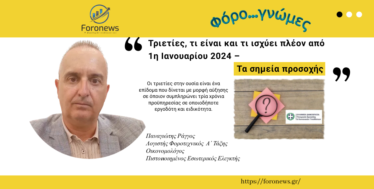 Φόρο..γνώμες : Τριετίες, τι είναι και τι ισχύει πλέον από 1η Ιανουαρίου 2024 – Τα σημεία προσοχής Οι τριετίες στην ουσία είναι ένα επίδομα που δίνεται με μορφή αύξησης σε όποιον συμπληρώνει τρία χρόνια προϋπηρεσίας σε οποιοδήποτε εργοδότη και ειδικότητα. Οι τριετίες είναι αναγνωρισμένες από όλες τις επιχειρήσεις και ισχύουν και σε αλλαγές μεταξύ εργοδοτών. Η αύξηση λόγω τριετιών υπολογίζεται σε ποσοστό 10% επί του κατώτατου μισθού και μπορεί να γίνει έως τρεις φορές. Ανώτατο επομένως όριο είναι οι τρεις τριετίες (30%). Μετά το 2012 που σταμάτησαν να εφαρμόζονται λόγω μνημονίων από την 1η Ιανουαρίου 2024 επανήλθαν. Για το διάστημα από την 14η Φεβρουαρίου 2012 έως και την 31η Ιανουαρίου 2023 δεν υφίσταται καμία τριετία. Επομένως, όσοι εργαζόμενοι προσλήφθηκαν σε αυτό το διάστημα, δεν ισχύουν οι τριετίες. Αντίθετα όσοι εργαζόμενοι είχαν προσληφθεί πριν από αυτό το διάστημα, οι τριετίες θα υπολογιστούν κανονικά. Για παράδειγμα, εάν ένας εργαζόμενος είχε προσληφθεί την 1η Φεβρουαρίου 2011 θα θεμελιώσει τριετία μετά την 1η Φεβρουαρίου 2026. Άμεσα αύξηση μέσα στο 2024 λόγω τριετίας (10%), θα δουν περίπου 100.000 εργαζόμενοι. Οι περισσότεροι την αύξηση θα την δουν από το 2027. Ø Τι ισχύει από την 1η Ιανουαρίου 2024 Από την 1η Ιανουαρίου 2024 πλέον θα ισχύουν τα εξής: → Για όσους εισήλθαν στην αγορά εργασίας μετά την 14η Φεβρουαρίου 2012 Οι εργαζόμενοι που αμείβονται με κατώτατο μισθό, θα αρχίσουν να χτίζουν το δικαίωμα του επιδόματος για πρώτη φορά από την 1η Ιανουαρίου 2024. Συγκεκριμένα: 780ευρώ από 0 έως 3 χρόνια 858 ευρώ από 3 έως 6 χρόνια 936 ευρώ από 6 έως 9 χρόνια 1.014 ευρώ από 9 έτη και πάνω → Για όσους εισήλθαν στην αγορά εργασίας πριν την 14η Φεβρουαρίου 2012 Εργαζόμενος με πρόσληψη προ του 2012 και προϋπηρεσία 2 ετών Το δικαίωμα ενεργοποίησης της 1ης τριετίας καθίσταται πληρωτέο με την συμπλήρωση τριετίας την 1η Ιανουαρίου 2025 με αύξηση 10% επί του τότε ισχύοντος βασικού μισθού. Με τα σημερινά δεδομένα θα έχουμε 780 ευρώ βασικός μισθός Χ 10% προσαύξηση τριετίας 78 ευρώ, ο μισθός θα διαμορφωθεί στα 858 ευρώ. Εργαζόμενος με πρόσληψη προ του 2012 και προϋπηρεσία 5 ετών Το δικαίωμα ενεργοποίησης της 2ης τριετίας καθίσταται πληρωτέο με την συμπλήρωση τριετίας την 1η Ιανουαρίου 2025 με αύξηση 20% επί του τότε ισχύοντος βασικού μισθού. Με τα σημερινά δεδομένα θα έχουμε 780 ευρώ βασικός μισθός Χ 20% προσαύξηση τριετίας 156 ευρώ, ο μισθός θα διαμορφωθεί στα 936 ευρώ. Εργαζόμενος με πρόσληψη προ του 2012 και προϋπηρεσία 8 ετών Το δικαίωμα ενεργοποίησης της 3ης τριετίας καθίσταται πληρωτέο με την συμπλήρωση τριετίας την 1η Ιανουαρίου 2025 με αύξηση 30% επί του τότε ισχύοντος βασικού μισθού. Με τα σημερινά δεδομένα θα έχουμε 780 ευρώ βασικός μισθός Χ 30% προσαύξηση τριετίας 234 ευρώ, ο μισθός θα διαμορφωθεί στα 1.014 ευρώ. Σημείωση: Σε περίπτωση συλλογικών συμβάσεων τα ανωτέρω όρια προσαρμόζονται ανάλογα με τον ισχύοντα σε επίπεδο βασικού μισθού και κλίμακας προσαυξήσεων. Επίσης, αν οι εργαζόμενοι έχουν ήδη δει αυξήσεις στους μισθούς ενδιαμέσως από το 2012 έως το 2023 και υπερβαίνουν τα σημερινά ισχύοντα είτε στον κατώτατο είτε σε αυτά που ορίζονται στις Συλλογικές Συμβάσεις Εργασίας (ΣΣΕ), τότε συμψηφίζονται με τα καταβαλλόμενα. Πρακτικά οι νέοι που έχουν δουλέψει από το 2012 έως το 2023 θα δουν την πρώτη αύξηση της πρώτης τριετίας μετά το 2027. Το «ξεπάγωμα» των τριετιών αφορά περίπου 600.000 εργαζόμενους του ιδιωτικού τομέα, περίπου δηλαδή το 20%