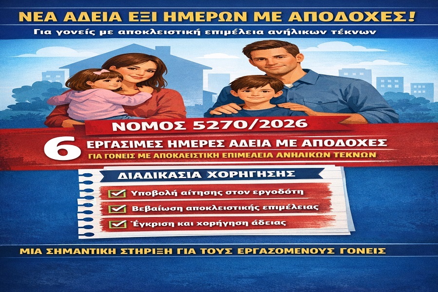 Νέα άδεια έξι ημερών με αποδοχές για γονείς με αποκλειστική επιμέλεια ανήλικων τέκνων – Ποια είναι η διαδικασία χορήγησης Εργατικά Νέα Επικαιρότητα Νέα σημαντική διευκόλυνση για εργαζόμενους γονείς θεσπίζει ο Νόμος 5270/2026, με τη δημιουργία ειδικής άδειας έξι εργάσιμων ημερών με αποδοχές για υπαλλήλους που έχουν την αποκλειστική επιμέλεια ανήλικων τέκνων. Η ρύθμιση αφορά εργαζόμενους τόσο στον δημόσιο όσο και στον ιδιωτικό τομέα και έχει στόχο την ενίσχυση των μονογονεϊκών οικογενειών, οι οποίες συχνά αντιμετωπίζουν αυξημένες υποχρεώσεις στην καθημερινότητα. Σύμφωνα με τη νέα διάταξη, οι δικαιούχοι μπορούν να λάβουν έως έξι επιπλέον ημέρες άδειας ετησίως, με πλήρεις αποδοχές. Η άδεια αυτή χορηγείται πέραν της κανονικής ετήσιας άδειας και άλλων γονικών διευκολύνσεων που προβλέπει η εργατική νομοθεσία. Ποιοι είναι οι δικαιούχοι Δικαίωμα στη συγκεκριμένη άδεια έχουν εργαζόμενοι που: έχουν την αποκλειστική επιμέλεια ανήλικου τέκνου ή τέκνων εργάζονται με σχέση εξαρτημένης εργασίας στον δημόσιο ή ιδιωτικό τομέα μπορούν να αποδείξουν την επιμέλεια μέσω δικαστικής απόφασης ή άλλου επίσημου εγγράφου Διαδικασία χορήγησης της άδειας Για τη χορήγηση της άδειας απαιτείται η υποβολή σχετικής αίτησης από τον εργαζόμενο προς τον εργοδότη ή την αρμόδια υπηρεσία προσωπικού. Η διαδικασία περιλαμβάνει τα εξής βασικά στάδια: Υποβολή αίτησηςΟ εργαζόμενος καταθέτει γραπτή αίτηση προς τον εργοδότη ή το τμήμα προσωπικού, δηλώνοντας ότι επιθυμεί να κάνει χρήση της ειδικής άδειας. Κατάθεση δικαιολογητικώνΜαζί με την αίτηση υποβάλλονται τα απαραίτητα έγγραφα που αποδεικνύουν την αποκλειστική επιμέλεια του παιδιού, όπως: δικαστική απόφαση επιμέλειας πιστοποιητικό οικογενειακής κατάστασης τυχόν άλλα έγγραφα που ζητά η υπηρεσία προσωπικού Έλεγχος από τον εργοδότη ή την υπηρεσίαΗ αρμόδια υπηρεσία εξετάζει τα δικαιολογητικά και επιβεβαιώνει ότι πληρούνται οι προϋποθέσεις του νόμου. Έγκριση της άδειαςΕφόσον ο έλεγχος ολοκληρωθεί θετικά, εγκρίνεται η άδεια και καταχωρίζεται στο σύστημα αδειών του εργαζομένου. Χορήγηση των ημερών άδειαςΟι έξι ημέρες μπορούν να ληφθούν είτε συνεχόμενα είτε τμηματικά μέσα στο ίδιο έτος, κατόπιν συνεννόησης με τον εργοδότη. Στόχος της νέας ρύθμισης Η θέσπιση της νέας άδειας εντάσσεται σε ένα ευρύτερο πλαίσιο μέτρων που αποσκοπούν στη στήριξη της οικογένειας και στη βελτίωση της ισορροπίας μεταξύ επαγγελματικής και οικογενειακής ζωής. Για τους εργαζόμενους που μεγαλώνουν μόνοι τα παιδιά τους, η συγκεκριμένη άδεια αναμένεται να αποτελέσει μια σημαντική διευκόλυνση, δίνοντάς τους περισσότερο χρόνο για την κάλυψη αναγκών που σχετίζονται με την υγεία, την εκπαίδευση ή άλλες υποχρεώσεις των ανήλικων τέκνων. Περισσότερες λεπτομέρειες σχετικά με την εφαρμογή του μέτρου αναμένεται να διευκρινιστούν μέσω εγκυκλίων και οδηγιών προς τους εργοδότες και τις αρμόδιες υπηρεσίες. Παναγιώτης Ράγγος Λογιστής Φοροτεχνικός Α΄ Τάξης - Πιστοποιημένος Εσωτερικός Ελεγκτή Previous Next