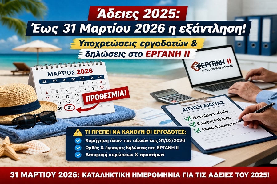Άδειες 2025: Έως 31 Μαρτίου 2026 η εξάντληση – Υποχρεώσεις εργοδοτών και δηλώσεις στο ΕΡΓΑΝΗ ΙΙ Νέα Επικαιρότητα εργασιακά Σαφές είναι πλέον το πλαίσιο για τη διαχείριση της ετήσιας κανονικής άδειας, με κρίσιμο σημείο όχι μόνο τη χορήγησή της αλλά και τη σωστή δήλωσή της στο πληροφοριακό σύστημα. Για τις άδειες του 2025, αυτές πρέπει να έχουν χορηγηθεί και εξαντληθεί το αργότερο έως τις 31 Μαρτίου 2026. ■ Ποιο είναι το χρονικό όριο εξάντλησης Οι ημέρες άδειας που αντιστοιχούν στο 2025: μπορούν να χορηγηθούν έως 31/03/2026 η ευθύνη για τη χορήγησή τους ανήκει στον εργοδότη Μετά την ημερομηνία αυτή, εφόσον δεν έχουν δοθεί, ενεργοποιούνται κυρώσεις. ■ Παράδειγμα Εργαζόμενος με υπόλοιπο 8 ημερών άδειας για το 2025: Λαμβάνει 5 ημέρες τον Ιανουάριο 2026 Λαμβάνει τις υπόλοιπες 3 ημέρες τον Μάρτιο 2026 Η υποχρέωση του εργοδότη θεωρείται εκπληρωμένη Αν όμως δεν χορηγηθούν έως 31/03/2026: ο εργαζόμενος δικαιούται διπλές αποδοχές άδειας ■ Συνέπειες μη χορήγησης Σε περίπτωση μη έγκαιρης χορήγησης: Καταβάλλονται: αποδοχές άδειας εις διπλούν επίδομα άδειας Υπάρχει κίνδυνος: διοικητικών προστίμων ελέγχων από τις αρμόδιες αρχές ■ Πώς δηλώνεται στο ΕΡΓΑΝΗ ΙΙ Η δήλωση γίνεται μέσω της ψηφιακής οργάνωσης χρόνου εργασίας στο ΕΡΓΑΝΗ ΙΙ. Συγκεκριμένα: Η άδεια δηλώνεται τον επόμενο μήνα από τον μήνα χορήγησης Κατά την καταχώρηση: επιλέγεται το έτος αναφοράς της άδειας (π.χ. 2025) καταγράφονται οι ημέρες που χορηγήθηκαν Παράδειγμα δήλωσης Εργαζόμενος λαμβάνει 4 ημέρες άδειας τον Φεβρουάριο 2026 (υπόλοιπο 2025): Η δήλωση γίνεται τον Μάρτιο 2026 Επιλογή: Έτος άδειας: 2025 Μήνας χορήγησης: Φεβρουάριος 2026 Ετήσιο αρχείο αδειών – Τελευταία υποβολή για το 2025 ■ Για τελευταία φορά ισχύει η υποχρέωση υποβολής ετήσιου αρχείου αδειών για το έτος 2025: Υποβάλλεται στο ΕΡΓΑΝΗ ΙΙ Χρονικό διάστημα υποβολής: από 1η Απριλίου 2026 έως 30 Απριλίου 2026 (με βάση τα ισχύοντα αυτή τη στιγμή). Μετά το 2025, η διαδικασία αντικαθίσταται πλήρως από τη συνεχή ψηφιακή καταγραφή μέσω της οργάνωσης χρόνου εργασίας. Επομένως, αυτή είναι η τελευταία χρονιά που θα υποβληθεί το έντυπο Ε11, καθώς από το 2026 το σύστημα καταργείται και αντικαθίσταται από την ψηφιακή δήλωση αδειών στο ΕΡΓΑΝΗ ΙΙ. ■ Τι πρέπει να προσέξουν οι επιχειρήσεις Έγκαιρη χορήγηση αδειών έως 31/03/2026 Ορθή μηνιαία δήλωση στο σύστημα Υποβολή του ετήσιου αρχείου εντός της νέας προθεσμίας ■ Συμπέρασμα Η ορθή διαχείριση των αδειών του 2025 απαιτεί συνδυασμό έγκαιρης χορήγησης και σωστής ψηφιακής καταγραφής. Η προθεσμία της 31ης Μαρτίου 2026 αποτελεί το τελικό όριο συμμόρφωσης, ενώ η τελευταία υποβολή του ετήσιου αρχείου αδειών σηματοδοτεί τη μετάβαση στο πλήρως ψηφιακό μοντέλο του ΕΡΓΑΝΗ ΙΙ. Παναγιώτης Ράγγος Λογιστής Φοροτεχνικός Α΄ Τάξης - Πιστοποιημένος Εσωτερικός Ελεγκτή Previous Next