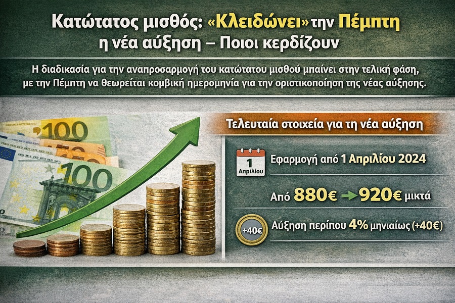 Κατώτατος μισθός: «Κλειδώνει» την Πέμπτη η νέα αύξηση – Ποιοι κερδίζουν Νέα Επικαιρότητα εργασιακά Η διαδικασία για την αναπροσαρμογή του κατώτατου μισθού μπαίνει στην τελική φάση, με την σημερινή ημέρα να θεωρείται κομβική ημερομηνία για την οριστικοποίηση της νέας αύξησης. Η εφαρμογή της αναμένεται από την 1η Απριλίου 2026, σηματοδοτώντας σημαντική ενίσχυση των χαμηλόμισθων. Τα τελευταία στοιχεία για το ύψος της αύξησης Σύμφωνα με τα πιο πρόσφατα δεδομένα, η αύξηση του κατώτατου μισθού αναμένεται να κινηθεί γύρω στα 40 ευρώ, γεγονός που σημαίνει ότι ο νέος μισθός θα διαμορφωθεί στα 920 ευρώ μικτά, από 880 ευρώ σήμερα. Πρόκειται για αύξηση περίπου 4% μηνιαίως, ποσοστό που θεωρείται πλέον το επικρατέστερο σενάριο. Η παρέμβαση αυτή αφορά άμεσα περίπου 575.000 εργαζόμενους στον ιδιωτικό τομέα, δηλαδή σχεδόν έναν στους τέσσερις μισθωτούς. Παράλληλα, έχει έμμεσο αντίκτυπο στο Δημόσιο, όπου ο κατώτατος λειτουργεί ως βάση για τον εισαγωγικό μισθό. Εκτιμάται ότι περίπου 600.000 δημόσιοι υπάλληλοι θα δουν αύξηση της τάξης των 40 ευρώ μηνιαίως, με διαφοροποιήσεις ανάλογα με τα μισθολογικά κλιμάκια. Διπλό όφελος για τους χαμηλόμισθους Χιλιάδες εργαζόμενοι θα έχουν διπλό κέρδος: από την προσαύξηση των τριετιών και την εφαρμογή μειωμένης φορολογίας, παράλληλα με την αύξηση του κατώτατου μισθού. Επιπλέον, η αύξηση του κατώτατου μισθού συμπαρασύρει προς τα πάνω 22 επιδόματα, ενισχύοντας περαιτέρω το εισόδημα των πολιτών. Ποιοι είναι οι άμεσα ωφελημένοι Εργαζόμενοι στον ιδιωτικό τομέα που αμείβονται με τον κατώτατο μισθό Νέοι εργαζόμενοι χωρίς προϋπηρεσία Μερικώς απασχολούμενοι, με αναλογική αύξηση Δικαιούχοι επιδομάτων, τα οποία συνδέονται με τον κατώτατο μισθό Παράλληλα, εργαζόμενοι που λαμβάνουν μισθούς κοντά στον κατώτατο θα δουν έμμεση αύξηση. Στόχοι της αύξησης Η νέα παρέμβαση στοχεύει: Στην ενίσχυση της αγοραστικής δύναμης Στη στήριξη των χαμηλόμισθων νοικοκυριών Στη διατήρηση της κοινωνικής συνοχής εν μέσω πληθωριστικών πιέσεων Ταυτόχρονα, εξετάζεται η ισορροπία μεταξύ στήριξης εργαζομένων και αντοχής των επιχειρήσεων. Πότε θα εφαρμοστεί Η νέα αύξηση θα τεθεί σε εφαρμογή από την 1η Απριλίου 2026, με τις νέες αποδοχές να εμφανίζονται άμεσα στους μισθούς των εργαζομένων, σηματοδοτώντας μια σημαντική οικονομική ανάσα για τους χαμηλόμισθους. Η αύξηση του κατώτατου μισθού αποτελεί μια από τις σημαντικότερες παρεμβάσεις για την καθημερινότητα των πολιτών, με άμεσο αντίκτυπο στην αγορά εργασίας και στην πραγματική οικονομία. Παναγιώτης Ράγγος Λογιστής Φοροτεχνικός Α΄ Τάξης - Πιστοποιημένος Εσωτερικός Ελεγκτή Previous Next