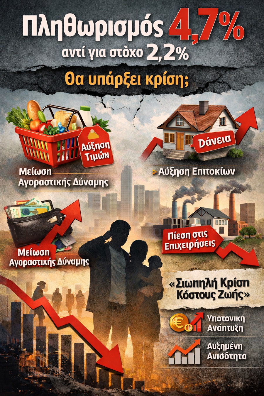 Πληθωρισμός 4,7% αντί για στόχο 2,2%: Τι σημαίνει, ποιες είναι οι επιπτώσεις και αν οδηγεί σε κρίση Νέα Επικαιρότητα Η άνοδος του πληθωρισμού στο 4,7%, υπερδιπλάσια από τον επίσημο στόχο του 2,2%, δεν είναι απλώς ένας οικονομικός δείκτης. Είναι μια εξέλιξη που επηρεάζει την καθημερινότητα των πολιτών, τη λειτουργία των επιχειρήσεων και τις αποφάσεις οικονομικής πολιτικής. Το βασικό ερώτημα όμως είναι: οδηγεί αυτόματα σε οικονομική κρίση; ■ Πλήγμα στην αγοραστική δύναμη Όταν ο πληθωρισμός αυξάνεται ταχύτερα από τους μισθούς, το πραγματικό εισόδημα μειώνεται. Παράδειγμα: Αν ένας εργαζόμενος λαμβάνει αύξηση 2% στον μισθό του, αλλά οι τιμές αυξάνονται κατά 4,7%, στην πράξη χάνει αγοραστική δύναμη σχεδόν 3%. Με τον ίδιο μισθό, καλύπτει λιγότερες ανάγκες. ■ Αύξηση του κόστους ζωής Ο υψηλός πληθωρισμός πλήττει πρώτα τα βασικά αγαθά: τρόφιμα, ενέργεια, ενοίκια. Παράδειγμα: Ένα νοικοκυριό που ξόδευε 800€ τον μήνα για βασικές ανάγκες, μπορεί εύκολα να χρειάζεται πλέον 840–860€, χωρίς καμία ποιοτική βελτίωση στο επίπεδο ζωής του. ■ Επιτόκια, δάνεια και επενδύσεις Όταν ο πληθωρισμός ξεφεύγει από τον στόχο, οι κεντρικές τράπεζες – όπως η Ευρωπαϊκή Κεντρική Τράπεζα – τείνουν να αυξάνουν τα επιτόκια. Παράδειγμα: Στεγαστικό δάνειο με κυμαινόμενο επιτόκιο μπορεί να δει τη μηνιαία δόση να αυξάνεται κατά 50–120€, πιέζοντας τον οικογενειακό προϋπολογισμό και περιορίζοντας την κατανάλωση. ■ Πιέσεις σε μισθούς και επιχειρήσεις Οι εργαζόμενοι ζητούν αυξήσεις για να καλύψουν το κόστος ζωής. Οι επιχειρήσεις, όμως, αντιμετωπίζουν αυξημένα κόστη και συχνά μετακυλίουν μέρος τους στις τιμές. Παράδειγμα: Μια μικρή επιχείρηση εστίασης με αυξημένο κόστος ενέργειας και πρώτων υλών είτε αυξάνει τιμές είτε μειώνει προσωπικό, επιβαρύνοντας την απασχόληση. ■ Θα υπάρξει οικονομική κρίση; Η σύντομη απάντηση είναι: όχι απαραίτητα αλλά ο κίνδυνος αυξάνεται. Ο πληθωρισμός στο 4,7% από μόνος του δεν σημαίνει άμεση κρίση. Κρίση προκύπτει όταν συνδυάζονται: παρατεταμένος υψηλός πληθωρισμός υψηλά επιτόκια για μεγάλο διάστημα χαμηλή ανάπτυξη ή ύφεση υπερχρέωση νοικοκυριών και κράτους Σε χώρες όπως η Ελλάδα, όπου το κόστος ζωής αυξάνεται γρηγορότερα από τα εισοδήματα, ο κίνδυνος είναι περισσότερο κοινωνικός και αναπτυξιακός παρά άμεσος χρηματοπιστωτικός. ■ Τι είδους «κρίση» είναι πιο πιθανή Δεν μιλάμε απαραίτητα για κατάρρευση τύπου 2010. Πιο πιθανό είναι ένα σενάριο: ,παρατεταμένης οικονομικής πίεσης χαμηλής ανάπτυξης μειωμένης κατανάλωσης αυξημένης ανισότητας Δηλαδή μια «σιωπηλή κρίση κόστους ζωής», που δεν φαίνεται άμεσα στους δείκτες, αλλά γίνεται αισθητή στην καθημερινότητα. ■ Συμπέρασμα Ο πληθωρισμός στο 4,7% δεν προκαλεί αυτόματα οικονομική κρίση. Αν όμως παραμείνει υψηλός για μεγάλο διάστημα και συνδυαστεί με αυστηρή νομισματική πολιτική και χαμηλή ανάπτυξη, μπορεί να εξελιχθεί σε σοβαρό οικονομικό και κοινωνικό πρόβλημα. Η πρόκληση είναι η έγκαιρη αποκλιμάκωση χωρίς να «παγώσει» η οικονομία – μια ισορροπία που θα καθορίσει τα επόμενα χρόνια. Παναγιώτης Ράγγος Λογιστής Φοροτεχνικός Α΄ Τάξης - Πιστοποιημένος Εσωτερικός Ελεγκτή Previous Next