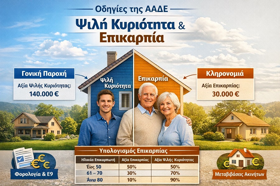 Οδηγίες της ΑΑΔΕ για ψιλή κυριότητα και επικαρπία – Τι ισχύει και αναλυτικά παραδείγματα Φορολογικά Νέα Επικαιρότητα Η ψιλή κυριότητα και η επικαρπία αποτελούν δύο βασικές έννοιες του εμπράγματου δικαίου που χρησιμοποιούνται συχνά στις μεταβιβάσεις ακινήτων, στις γονικές παροχές και στις κληρονομιές. Οι οδηγίες της ΑΑΔΕ καθορίζουν τον τρόπο με τον οποίο υπολογίζεται η αξία τους για φορολογικούς σκοπούς, αλλά και πώς δηλώνονται στις φορολογικές δηλώσεις και στο Ε9. Τι είναι η επικαρπία και τι η ψιλή κυριότητα Η επικαρπία είναι το δικαίωμα ενός προσώπου να χρησιμοποιεί ένα ακίνητο και να απολαμβάνει τα οφέλη του (π.χ. να κατοικεί ή να εισπράττει ενοίκιο), χωρίς όμως να είναι ο πλήρης ιδιοκτήτης. Η ψιλή κυριότητα είναι το δικαίωμα ιδιοκτησίας του ακινήτου χωρίς όμως το δικαίωμα χρήσης όσο υπάρχει επικαρπία. Με απλά λόγια: Ο επικαρπωτής χρησιμοποιεί το ακίνητο. Ο ψιλός κύριος είναι ο ιδιοκτήτης που θα αποκτήσει πλήρη κυριότητα όταν λήξει η επικαρπία (συνήθως με τον θάνατο του επικαρπωτή). Η διάσπαση αυτή χρησιμοποιείται συχνά σε γονικές παροχές, όπου οι γονείς κρατούν την επικαρπία και μεταβιβάζουν στα παιδιά την ψιλή κυριότητα. Πώς υπολογίζεται η αξία επικαρπίας και ψιλής κυριότητας Για φορολογικούς σκοπούς, η αξία της επικαρπίας και της ψιλής κυριότητας εξαρτάται από την ηλικία του επικαρπωτή. Ποσοστά αξίας επικαρπίας (βάσει ηλικίας) Ηλικία επικαρπωτή Αξία επικαρπίας Αξία ψιλής κυριότητας έως 20 ετών 80% 20% 21–30 70% 30% 31–40 60% 40% 41–50 50% 50% 51–60 40% 60% 61–70 30% 70% 71–80 20% 80% άνω των 80 10% 90% Τα ποσοστά αυτά χρησιμοποιούνται από την ΑΑΔΕ για τον υπολογισμό του φόρου σε μεταβιβάσεις, γονικές παροχές και κληρονομιές. Παράδειγμα 1 – Γονική παροχή με επικαρπία Έστω ότι ένας πατέρας μεταβιβάζει στο παιδί του την ψιλή κυριότητα ενός διαμερίσματος αντικειμενικής αξίας 200.000 ευρώ, κρατώντας ο ίδιος την επικαρπία. Αν ο πατέρας είναι 65 ετών, τότε: Αξία επικαρπίας: 30% Αξία ψιλής κυριότητας: 70% Υπολογισμός: Επικαρπία: 200.000 × 30% = 60.000 € Ψιλή κυριότητα: 200.000 × 70% = 140.000 € Για τη γονική παροχή φορολογείται μόνο η αξία της ψιλής κυριότητας. Παράδειγμα 2 – Κληρονομιά με επικαρπία Μητέρα ηλικίας 75 ετών αφήνει σε δύο παιδιά ακίνητο αξίας 150.000 ευρώ, αλλά ο σύζυγος κρατά την επικαρπία. Ηλικία επικαρπωτή: 75 Αξία επικαρπίας: 20% Αξία ψιλής κυριότητας: 80% Υπολογισμός: Επικαρπία: 150.000 × 20% = 30.000 € Ψιλή κυριότητα: 150.000 × 80% = 120.000 € Αν τα παιδιά μοιραστούν την ψιλή κυριότητα: Κάθε παιδί: 60.000 € αξία δικαιώματος Παράδειγμα 3 – Μετατροπή σε πλήρη κυριότητα Όταν ο επικαρπωτής αποβιώσει: Η επικαρπία σβήνει αυτόματα Ο ψιλός κύριος αποκτά πλήρη κυριότητα χωρίς νέο φόρο μεταβίβασης Ωστόσο απαιτείται: δήλωση στο Ε9 ενημέρωση στο Κτηματολόγιο. Τι ισχύει για το Ε9 Στο Ε9 πρέπει να δηλώνονται χωριστά τα δικαιώματα: Κωδικός 1: πλήρης κυριότητα Κωδικός 2: ψιλή κυριότητα Κωδικός 3: επικαρπία Η σωστή καταχώριση επηρεάζει τον υπολογισμό του ΕΝΦΙΑ, καθώς η επιβάρυνση κατανέμεται ανάλογα με το δικαίωμα. Πότε συμφέρει η μεταβίβαση ψιλής κυριότητας Η μεταβίβαση ψιλής κυριότητας χρησιμοποιείται συχνά για: μείωση φορολογικής επιβάρυνσης έγκαιρη μεταβίβαση περιουσίας στα παιδιά διατήρηση χρήσης του ακινήτου από τους γονείς Ιδιαίτερα μετά την αύξηση του αφορολόγητου στις γονικές παροχές έως 800.000 ευρώ, πολλές οικογένειες επιλέγουν αυτό το μοντέλο μεταβίβασης. Συμπέρασμα Η διάκριση μεταξύ ψιλής κυριότητας και επ