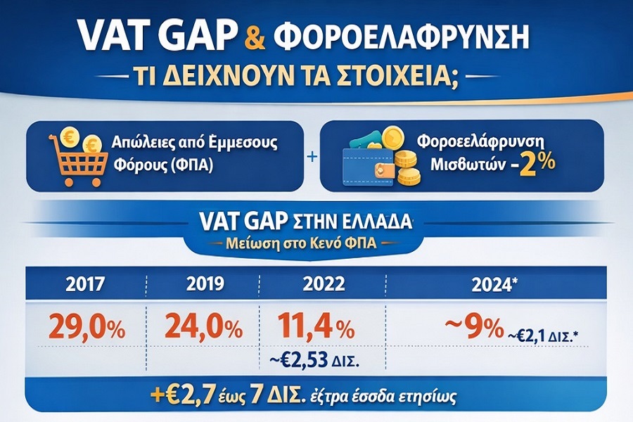 VAT Gap, Έμμεσοι Φόροι και Φοροελάφρυνση — Τι δείχνουν τα στοιχεία στην Ελλάδα το 2025–2026 Φορολογικά Νέα Επικαιρότητα Η συζήτηση γύρω από τη φορολογική πολιτική στην Ελλάδα έχει δύο βασικούς άξονες αυτό το διάστημα: από τη μία πλευρά, τις απώλειες εσόδων από έμμεσους φόρους όπως ο ΦΠΑ και από την άλλη τα μέτρα φοροελάφρυνσης για μισθωτούς που ανακοίνωσε η κυβέρνηση. Ορισμένες ανακοινώσεις μιλούν για «πτώση >13% στις απώλειες εισπράξεων», ενώ οι φοροελαφρύνσεις στους μισθωτούς φέρονται να είναι ~2%. Ας δούμε τι ισχύει στην πραγματικότητα με βάση τα διαθέσιμα στοιχεία. → Τι είναι το VAT Gap Ο όρος VAT gap (κενό ΦΠΑ) αναφέρεται στη διαφορά ανάμεσα στα έσοδα από ΦΠΑ που θα έπρεπε να εισπραχθούν υπό πλήρη συμμόρφωση και στα πραγματικά εισπραχθέντα. Περιλαμβάνει: τη μη συμμόρφωση / φοροδιαφυγή, λάθη διοίκησης, έκπτωση λόγω εξαιρέσεων/μειωμένων συντελεστών. Είναι δείκτης για την αποτελεσματικότητα της συλλογής των έμμεσων φόρων. → VAT Gap στην Ελλάδα — Αριθμητικά στοιχεία Χρόνος VAT Gap (% του VTTL) € Απωλειών (περίπου) 2017 29,0% — 2019 24,0% — 2022 13,7% ~€3,0 δισ. 2023 11,4% ~€2,53 δισ. 2024* ~9,0% (εκτίμηση) ~€2,1 δισ.* *Αυτά τα στοιχεία του 2024 είναι προκαταρκτικές εκτιμήσεις της ΕΕ/AADE. → Τι δείχνουν αυτά τα νούμερα Το VAT gap στην Ελλάδα έχει μειωθεί δραματικά μέσα σε λίγα χρόνια — από 29% το 2017 σε περίπου 11,4% το 2023 και πιθανώς κάτω από 10% το 2024. Αυτό σημαίνει ότι το κράτος χάνει λιγότερα έσοδα από ΦΠΑ λόγω φοροδιαφυγής/μη συμμόρφωσης, κυρίως λόγω μέτρων όπως η καθολική χρήση POS και ηλεκτρονικών πληρωμών, τα ψηφιακά βιβλία (myDATA) και η αποτροπή «μαύρου τζίρου». Η μείωση από 24% (2019) σε 11,4% (2023) αντιστοιχεί σε μείωση κατά ~12,6 ποσοστιαίες μονάδες ή ~55% του κενού ΦΠΑ σε πέντε χρόνια. → Σύγκριση με την ΕΕ Σύμφωνα με στοιχεία της Ευρωπαϊκής Επιτροπής για το 2023: Μέσο VAT gap στην ΕΕ: ~9,5% του VAT Total Tax Liability (VTTL). Η Ελλάδα (11,4%) βρίσκεται πάνω από τον μέσο όρο αλλά έχει πλησιάσει σημαντικά τα ευρωπαϊκά επίπεδα. Άλλες χώρες με υψηλότερο VAT gap στο ίδιο έτος περιλαμβάνουν Ρουμανία, Μάλτα και Πολωνία. → Γράφημα 1 — Εξέλιξη του VAT Gap (% του VTTL) | 2017 | 2019 | 2022 | 2023 | 2024* | Greece | 29.0 | 24.0 | 13.7 | 11.4 | ~9.0 | EU Avg. | 11.1 | 11.0 | 7.0 | 9.5 | ~9.5 | Οριζόντιος άξονας: έτη Κατακόρυφος άξονας: ποσοστό VAT gap → Γράφημα 2 → Τι σημαίνει μείωση του VAT Gap σε πραγματικά έσοδα Η μείωση του κενoύ ΦΠΑ δεν σημαίνει απλώς καλύτερα στατιστικά — μεταφράζεται σε πραγματικά πρόσθετα έσοδα για το κράτος χωρίς αύξηση των συντελεστών: Σύμφωνα με εκτιμήσεις, η μείωση του VAT gap αντιστοιχεί σε ~€2,7–€7 δισ. ετησίως επιπλέον έσοδα που πλέον εισπράττονται από τον ΦΠΑ σε σύγκριση με προηγούμενα έτη. Αυτό είναι μια σημαντική βελτίωση της φορολογικής συμμόρφωσης και της διοικητικής αποτελεσματικότητας, που ενισχύει τα κρατικά ταμεία χωρίς νέα φορολογικά βάρη. → Η φοροελάφρυνση στους μισθωτούς (~2%) — Τι ισχύει Αντίθετα με τη σημαντική μείωση του VAT gap, η φοροελάφρυνση για μισθωτούς που ανακοίνωσε η κυβέρνηση είναι συγκριτικά μικρότερη — της τάξης περίπου 2% μείωση στον συνολικό φόρο εισοδήματος για μισθωτούς. Αυτό αφορά κυρίως προσαρμογές σε κλίμακες και συντελεστές φορολογίας εισοδήματος και οδηγεί σε μικρή αύξηση του διαθέσιμου εισοδήματος για τους εργαζόμενους. Δηλαδή, το 2% αφορά άμεσο όφελος στους μισθωτούς, ενώ η μείωση του VAT gap αναφέρεται στο συνολικό φορολογικό σύστημα και τα έσοδα από ΦΠΑ που επηρεάζουν τον προϋπολογισμό ευρύτερα. Αυτά τα δύο πράγματα είναι διαφορετικά είδη μέτρων και δεν σ