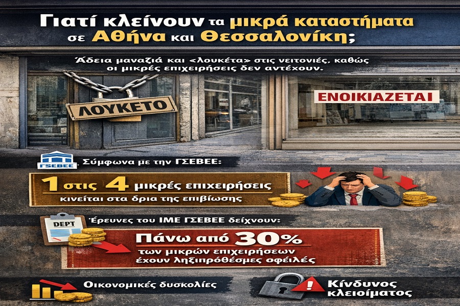 Γιατί κλείνουν τα μικρά καταστήματα σε Αθήνα και Θεσσαλονίκη; Νέα Επικαιρότητα Οικονομία Τα τελευταία χρόνια, όλο και περισσότερα μικρά καταστήματα σε Αθήνα και Θεσσαλονίκη βάζουν «λουκέτο», αφήνοντας πίσω άδειες βιτρίνες και γειτονιές χωρίς την παλιά τους ζωντάνια. Το φαινόμενο αυτό δεν είναι τυχαίο· αποτελεί αποτέλεσμα μιας σειράς οικονομικών, κοινωνικών και τεχνολογικών αλλαγών που επηρεάζουν βαθιά τη μικρομεσαία επιχειρηματικότητα στην Ελλάδα. ■ Τι δείχνουν τα στοιχεία Η εικόνα επιβεβαιώνεται και από τα διαθέσιμα δεδομένα της αγοράς: - Σύμφωνα με στοιχεία από την ΓΣΕΒΕΕ, περίπου 1 στις 4 μικρές επιχειρήσεις δηλώνει ότι κινείται στα όρια της επιβίωσης. - Έρευνες του ΙΜΕ ΓΣΕΒΕΕ δείχνουν ότι πάνω από το 30% των μικρών επιχειρήσεων έχει ληξιπρόθεσμες οφειλές, γεγονός που αυξάνει τον κίνδυνο κλεισίματος. - Στην περίοδο μετά την πανδημία, καταγράφηκε ότι χιλιάδες μικρές επιχειρήσεις δεν επανήλθαν ποτέ σε προ κρίσης επίπεδα τζίρου, με απώλειες που σε αρκετές περιπτώσεις ξεπερνούν το 20–30%. - Παράλληλα, η ΕΛΣΤΑΤ καταγράφει συρρίκνωση στον αριθμό πολύ μικρών επιχειρήσεων σε συγκεκριμένους κλάδους λιανικής, ιδιαίτερα στο ένδυμα και την εστίαση. - Την ίδια στιγμή, το ηλεκτρονικό εμπόριο στην Ελλάδα παρουσιάζει σταθερή άνοδο, με εκτιμήσεις της Ελληνικός Σύνδεσμος Ηλεκτρονικού Εμπορίου να δείχνουν ότι πάνω από το 60% των καταναλωτών πραγματοποιεί online αγορές σε τακτική βάση. Τα στοιχεία αυτά αποτυπώνουν μια ξεκάθαρη τάση: οι μικρές επιχειρήσεις βρίσκονται υπό έντονη πίεση, τόσο από το κόστος λειτουργίας όσο και από τη μεταβολή της καταναλωτικής συμπεριφοράς. 1. Αύξηση λειτουργικού κόστους Ένας από τους βασικότερους λόγους είναι η συνεχής αύξηση των εξόδων. Ενοίκια, λογαριασμοί ενέργειας, πρώτες ύλες και φορολογία έχουν αυξηθεί σημαντικά. Για ένα μικρό κατάστημα, αυτά τα κόστη συχνά είναι δυσβάσταχτα, ειδικά όταν ο τζίρος δεν ακολουθεί ανάλογη πορεία. 2. Μείωση αγοραστικής δύναμης Η οικονομική πίεση στα νοικοκυριά έχει περιορίσει τις καταναλωτικές δαπάνες. Οι καταναλωτές αγοράζουν λιγότερα ή επιλέγουν φθηνότερες λύσεις, γεγονός που επηρεάζει άμεσα τις μικρές επιχειρήσεις που δεν μπορούν να ανταγωνιστούν στις τιμές. 3. Ανταγωνισμός από μεγάλες αλυσίδες Οι μεγάλες εμπορικές αλυσίδες διαθέτουν πλεονεκτήματα όπως χαμηλότερες τιμές, μεγαλύτερη ποικιλία προϊόντων και ισχυρό marketing. Αυτό καθιστά δύσκολο για ένα μικρό κατάστημα να διατηρήσει την πελατεία του. 4. Η άνοδος του ηλεκτρονικού εμπορίου Το online shopping έχει αλλάξει ριζικά τις συνήθειες των καταναλωτών. Πολλοί προτιμούν την ευκολία των ηλεκτρονικών αγορών, συχνά σε χαμηλότερες τιμές. Τα μικρά καταστήματα που δεν έχουν ψηφιακή παρουσία μένουν πίσω στον ανταγωνισμό. 5. Έλλειψη προσαρμοστικότητας Η αγορά αλλάζει γρήγορα και απαιτεί ευελιξία. Επιχειρήσεις που δεν επενδύουν σε νέες τεχνολογίες, marketing ή ανανέωση των προϊόντων τους δυσκολεύονται να επιβιώσουν. 6. Γραφειοκρατία και φορολογική πίεση Η πολυπλοκότητα της νομοθεσίας και τα υψηλά φορολογικά βάρη λειτουργούν αποτρεπτικά για τη βιωσιμότητα των μικρών επιχειρήσεων. Πολλοί επαγγελματίες νιώθουν ότι δεν έχουν την απαραίτητη στήριξη. ■ Υπάρχει μέλλον για τα μικρά καταστήματα; Παρά τις δυσκολίες, τα μικρά καταστήματα δεν είναι καταδικασμένα. Αντίθετα, μπορούν να επιβιώσουν και να αναπτυχθούν αν αξιοποιήσουν τα πλεονεκτήματά του
